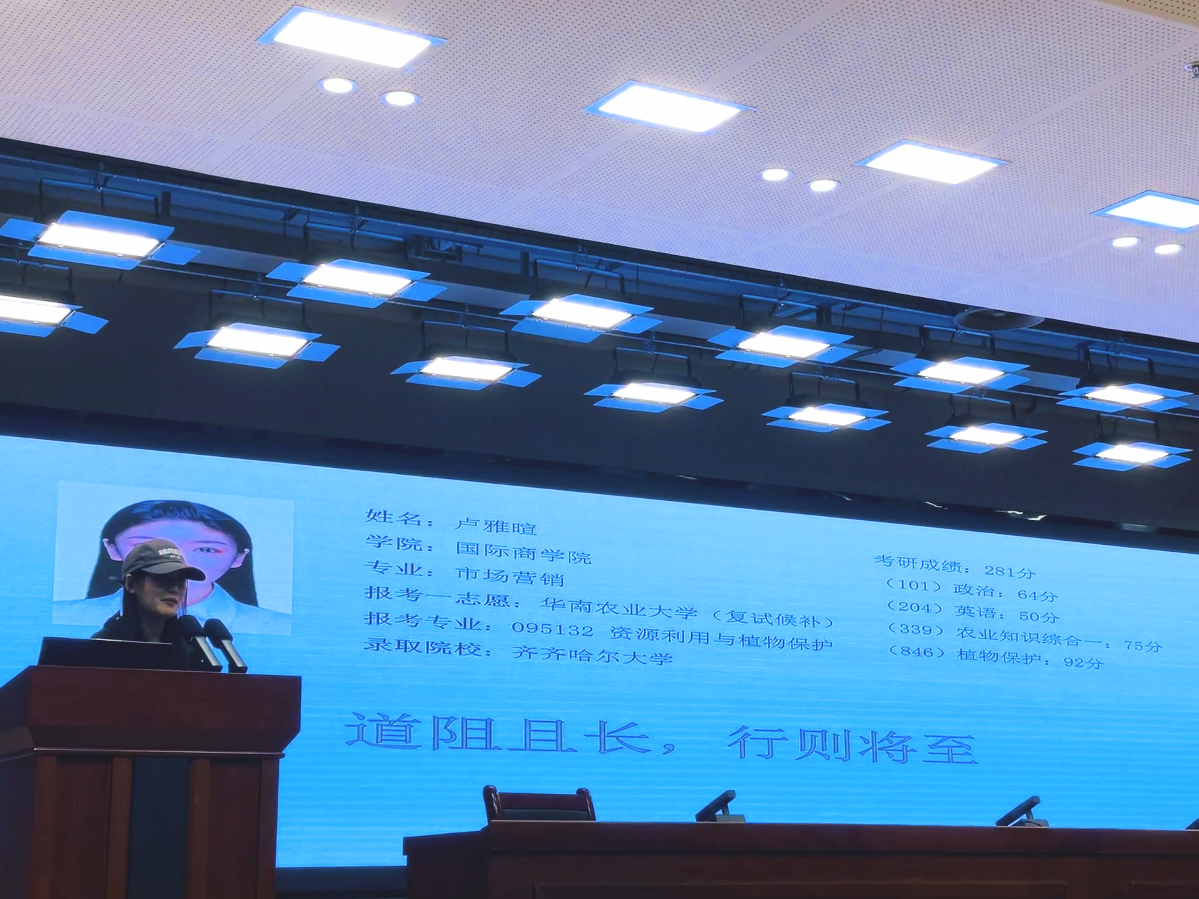 潘韦孜(2021级市场营销本科1班):其实在上午收到要去参加考研动员会的消息时,我的第一反应是,好像跟我没什么关系,但听完整场的动员会后,我反而有了不少感受。在会议刚开始的时候,曾老师介绍了我们市场营销的老师们,我当时就感觉好像见到了我的老朋友,觉得特别亲切!在后面也提到了我们的朋友之一就是学业导师,我们市场营销好像一个大家庭的感觉!后来到了第一位学姐上台分享的阶段,我印象最深的就是她说在考场里其实有很多空的位置,听到这句话的时候,我好像把自己放在了考场里,然后感觉能坚持到考试这一天,其实已经是小小的胜利了!无论我以后是否考研,这种模拟的场景已经印在我的脑海里了。再后来到肖教授上台的时候,我瞬间感觉格局打开了,就像肖教授所说,一个家庭的战略选择了让我们来读书,也让我感觉确实应该为自己的选择付出实际的努力了!