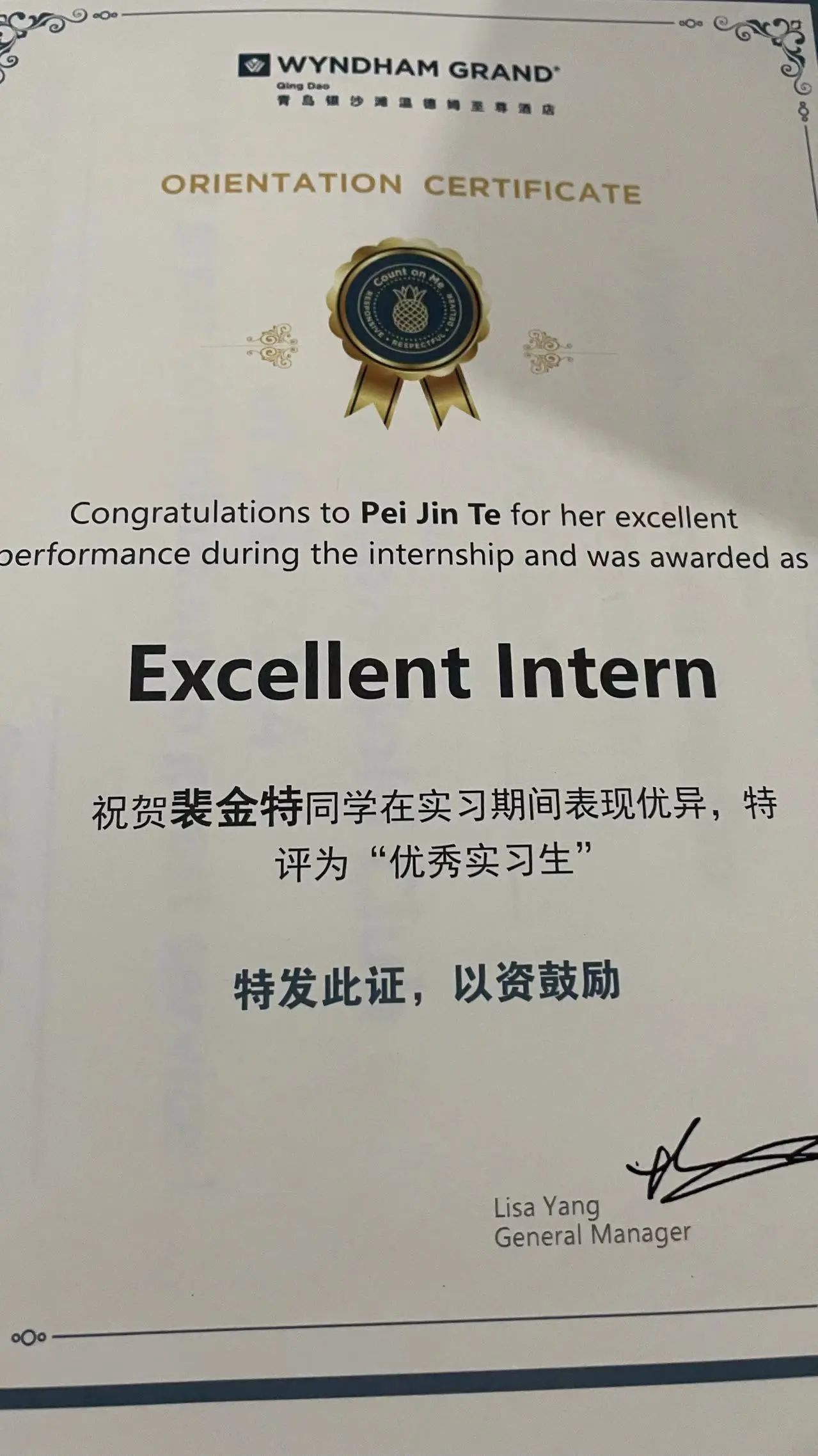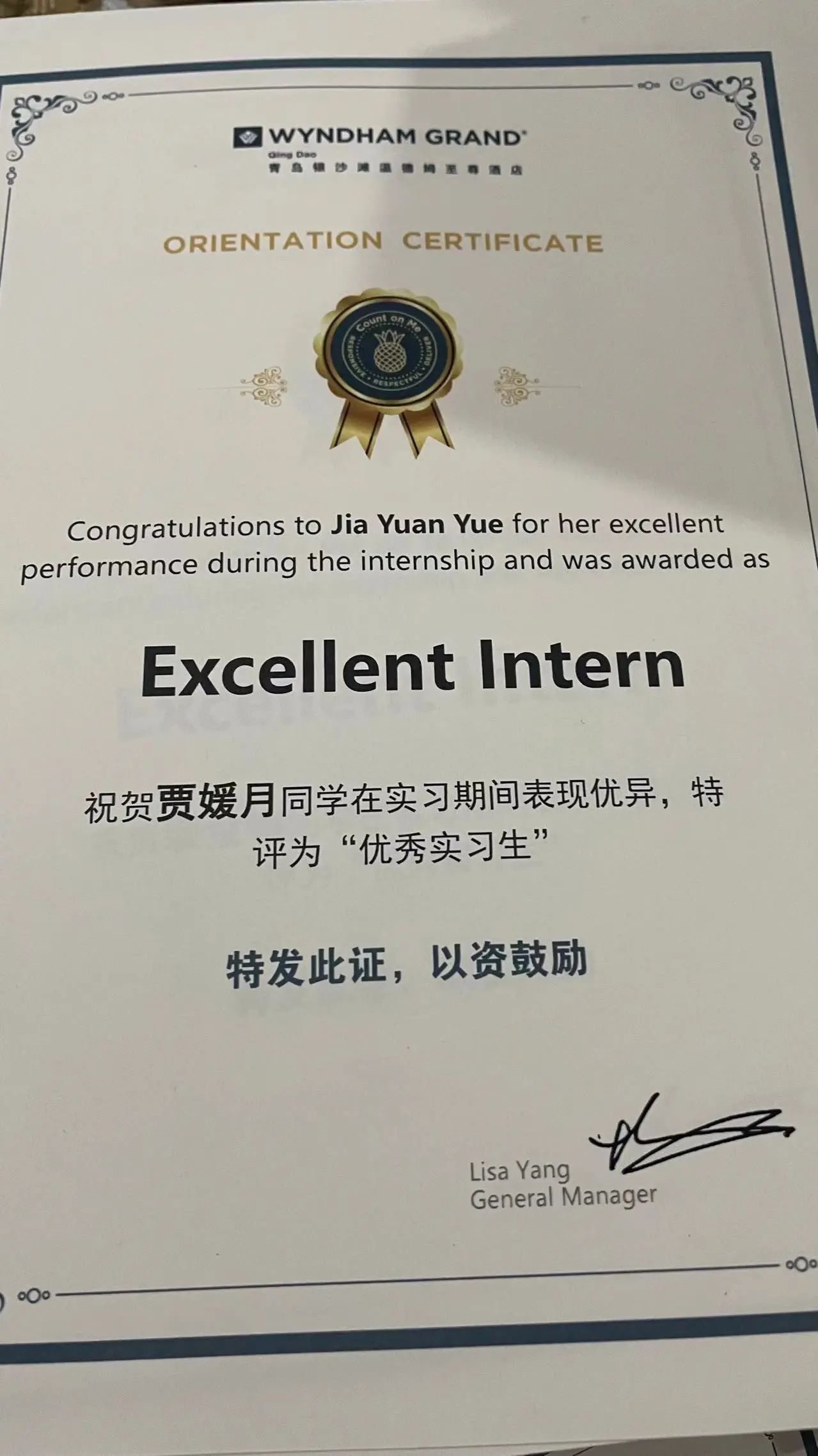 在青岛银沙滩温德姆至尊酒店专业技能实习的裴金特和贾媛月同学实习期间表现优异,得到了酒店领导的肯定,被评为“优秀实习生”,酒店总经理与他们合影留念。