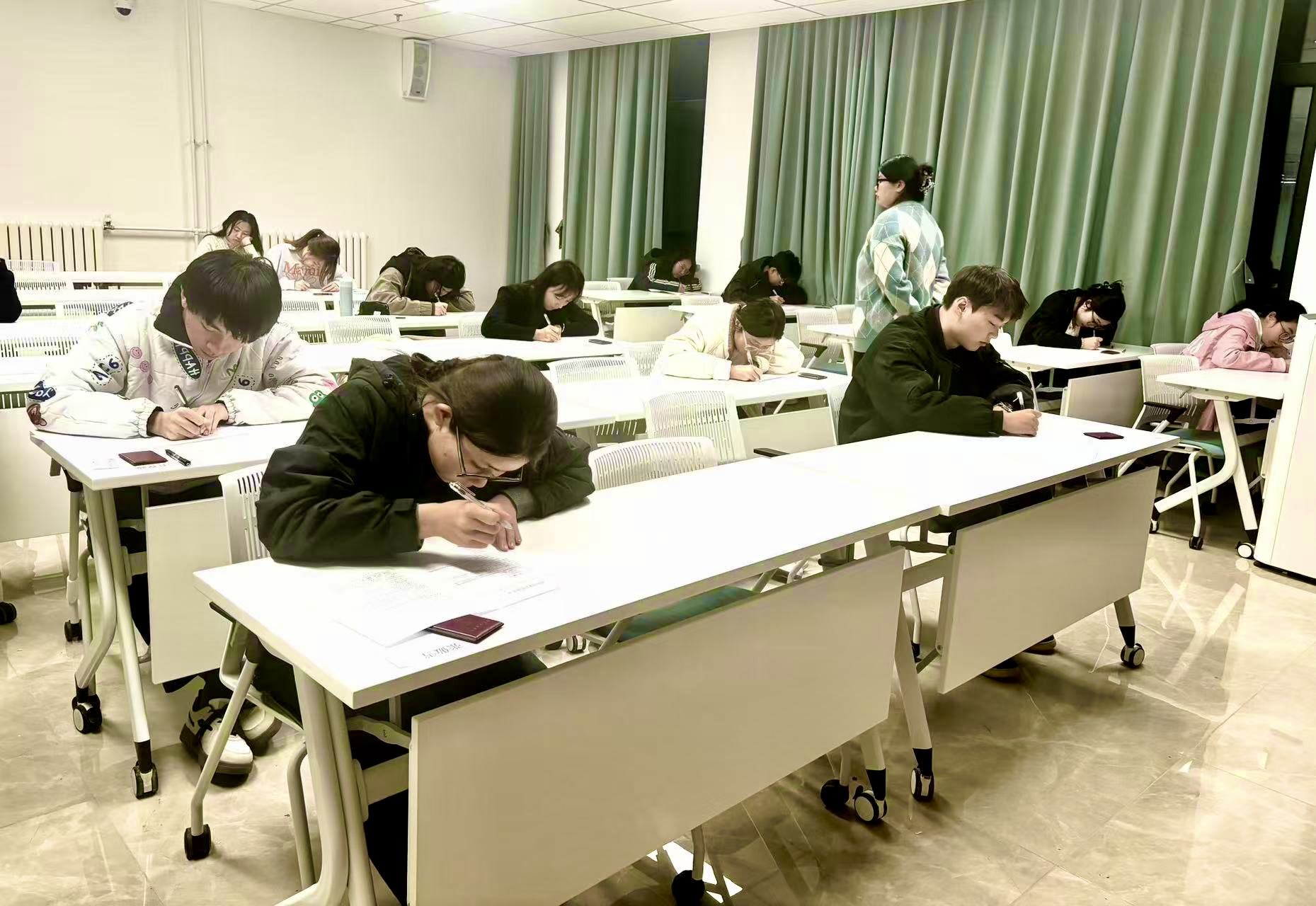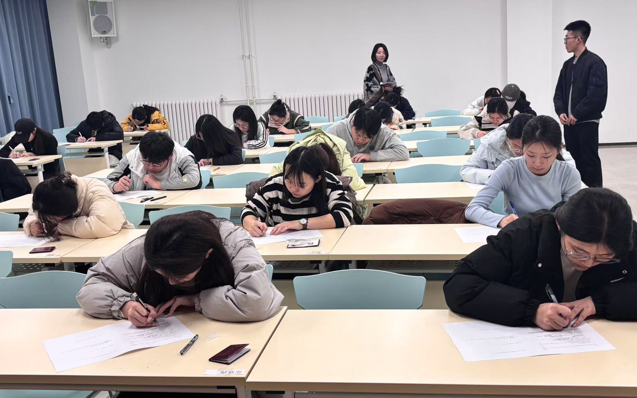 除了全神贯注的考生,负责在现场视察的国际商学院团总支书记于小燕老师更是展现出作为教师的独特精神风貌。她身姿挺拔,目光如炬,既保持着必要的威严,又不失温情关怀,时刻关注着每位考生的状态,确保考试环境的有序与安静,为考生们保驾护航,让考生们在一个公平、安全、无压力的环境中发挥出最佳水平。