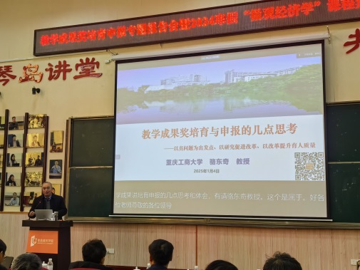 2025年1月4日,一场聚焦“教学成果奖培育申报专题报告会暨2024年寒假微观经济学课程集体备课会”的专题报告会在青岛城市学院隆重举行,山东省教育厅领导以及全国各高校学院领导出席会议,同时吸引了众多教育界的同仁前来参与。受主办单位邀请,国际商学院共12名教师参加了此次会议,其中2人参加线下会议,10人参加线上会议。此次报告会聚焦于教学成果奖的培育与申报,以及翻转课堂背景下微观经济学课程教学案例研讨,旨在通过深入交流与分享,帮助高校教师更好地理解教学成果奖的申报要求,提升申报质量,进而推动教育教学改革与创新。