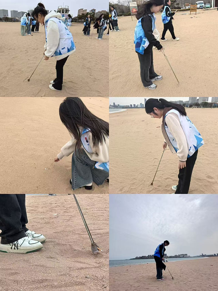 海风轻拂,波浪翻涌,湛蓝天空与澄澈海水相映成趣,然而海滩上散落的垃圾却破坏了这方美景。“小黄锋”志愿者们手持捡垃圾的钳子,拎着垃圾袋,沿着海岸线仔细搜寻。从烟头、塑料瓶,到包装袋、破碎的木板,不放过任何一处与大海不和谐的地方。大家或两两合作,或独自行动,专注地清理着沙滩上的每一片垃圾。海风呼啸,却吹不灭同学们心中的热情。尽管弯腰俯身的动作重复了无数次,汗水浸湿了衣衫,但没有一个人喊累。