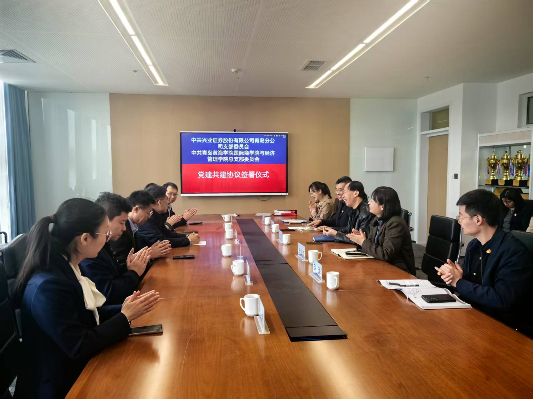 2025年3月27日上午,中共兴业证券股份有限公司青岛分公司支部委员会与中共青岛黄海学院国际商学院与经济管理学院总支部委员会在青岛黄海学院举行党建共建协议签署仪式。此次合作以“党建引领、协同育人、服务新区”为宗旨,通过校企党建联建,创新探索党建与业务深度融合的新路径,为青岛西海岸新区高质量发展注入新活力。