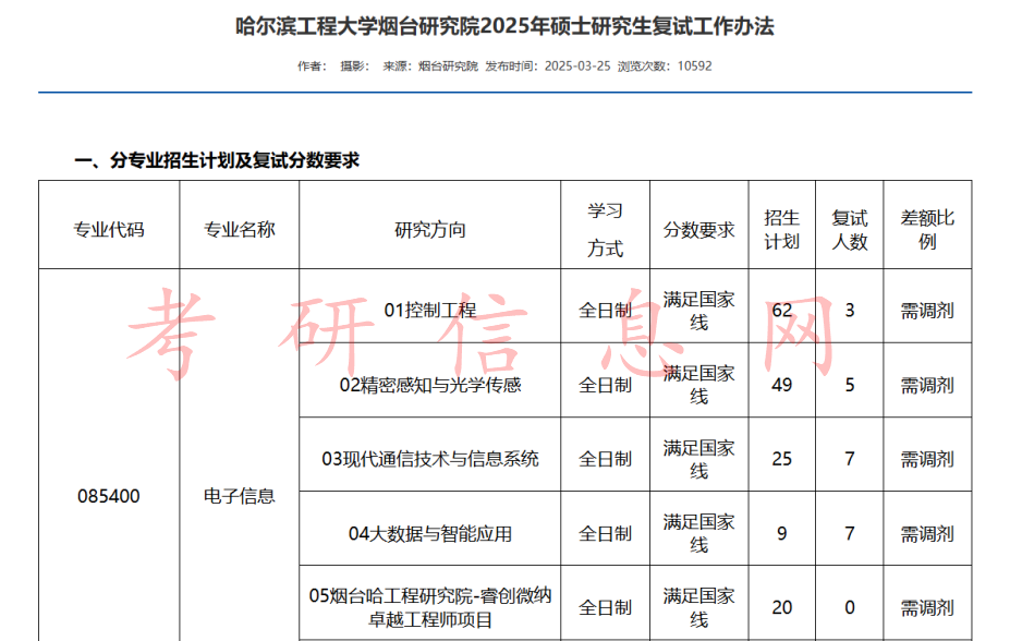 哈尔滨工程大学烟台研究院发布了2025年硕士研究生复试工作办法其中公布了需要调剂的专业。