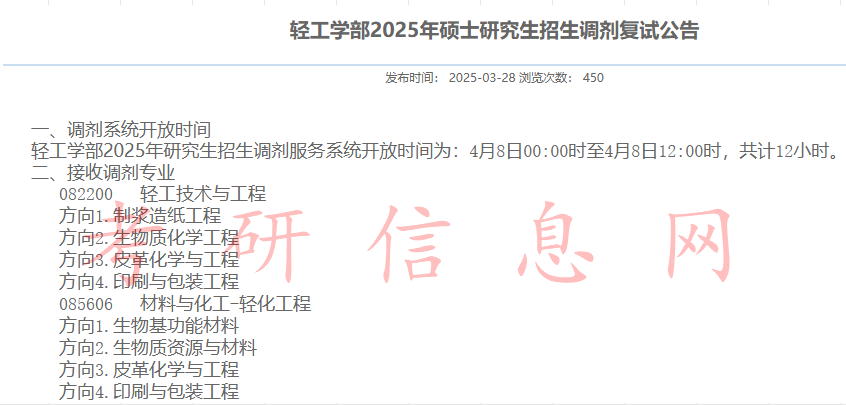 齐鲁工业大学轻工学部发布了2025年硕士研究生招生调剂复试公告。