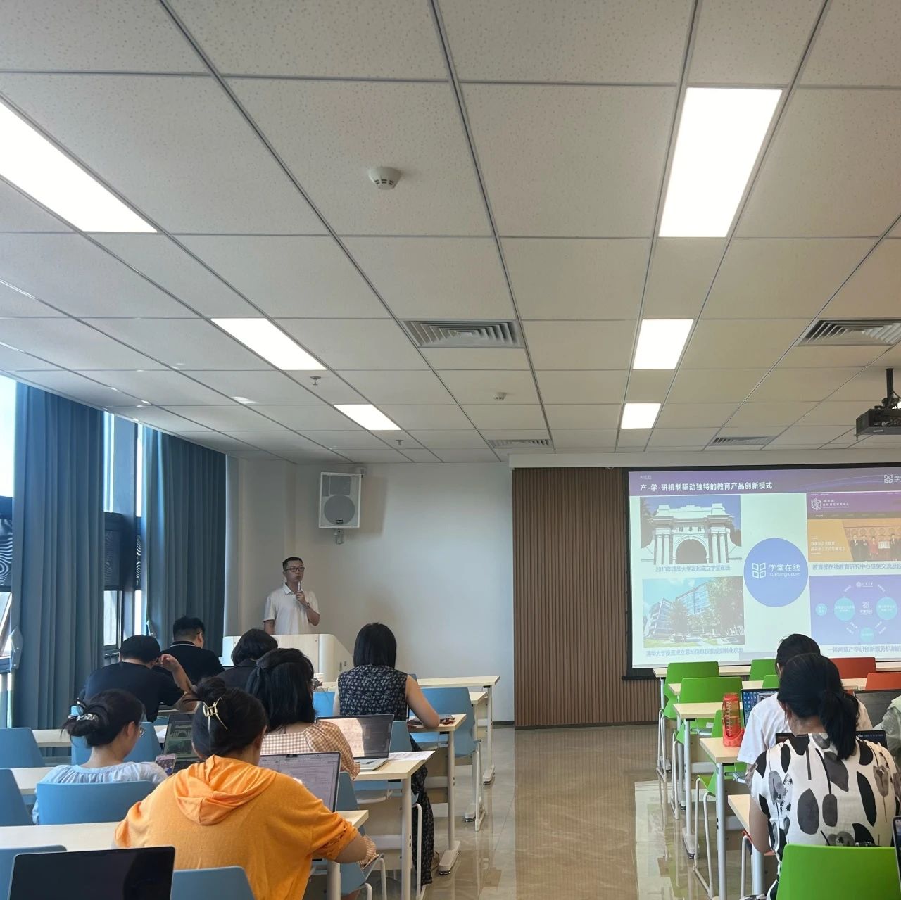 为积极拥抱教育数字化浪潮,切实解决一线教师在混合式教学实践中面临的痛点与挑战,提升智慧教学工具的应用能力,国际商学院于近日精心组织了一系列AI赋能教学深度应用实战培训。7月17日上午,系列培训第一场——“AI赋能教育教学活动”专题分享会在知信楼435教室举行。学院领导班子、各系部骨干教师共计70余人参会。本次分享会特邀雨课堂高级培训顾问许腾老师担任主讲,围绕“人工智能如何深度融入教学场景”作系统讲解与实操演示。