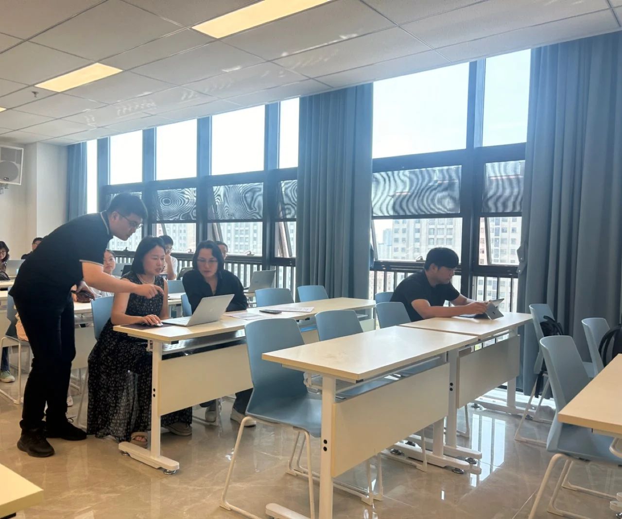 在准备工作与身份绑定环节,详细演示教师账号注册、角色权限配置及多平台数据互通技巧;通过实时问答、匿名调研等功能构建教学反馈闭环;在平台登录与课程建设板块,结合国际商学院课程特色,现场搭建包含课件推送、随堂测试、分组协作的完整课程框架。培训特别设置AI应用讲解专场,许腾老师通过智能学情分析、自动作业批改、虚拟助教等案例,生动展示人工智能如何赋能个性化教学。