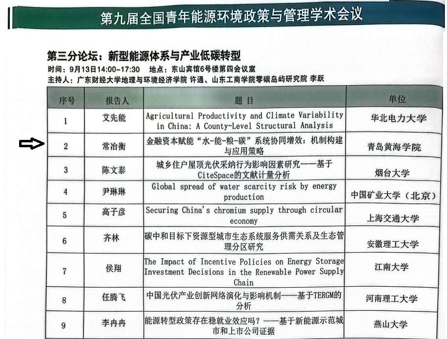 2025年9月13-14日,第九届全国青年能源环境政策与管理学术会议在山东烟台东山宾馆隆重召开。国际商学院常冶衡教授参加会议,并在“新型能源体系与产业低碳转型”分论坛作主题汇报,题目为《金融资本赋能“水-能-粮-碳”系统协同增效:机制构建与应用策略》,引发热烈讨论。
