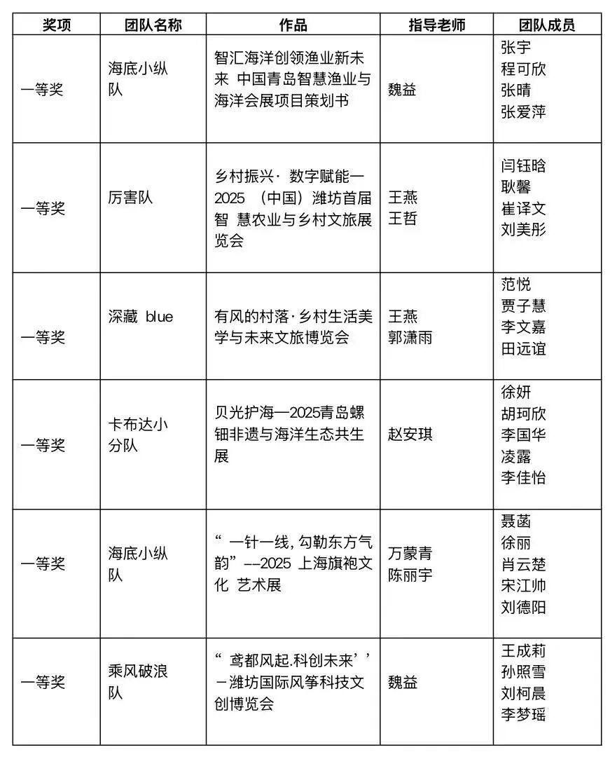 由中国贸促会商业行业委员会、中国国际商会商业行业商会、中国商业经济学会和中国会展经济研究会联合主办的2026年(新加坡)国际商务会展策划大赛中国地区选拔赛暨第十九届全国高校商业精英挑战赛会展创新创业实践竞赛山东省总决赛,经过理论知识赛、校赛、省赛等层层选拔,于2025年9月26日圆满落下帷幕。我校共19支参赛队伍在会展项目策划竞赛中获奖,其中“海底小纵队”等11支队伍更是拔得头筹,斩获一等奖。