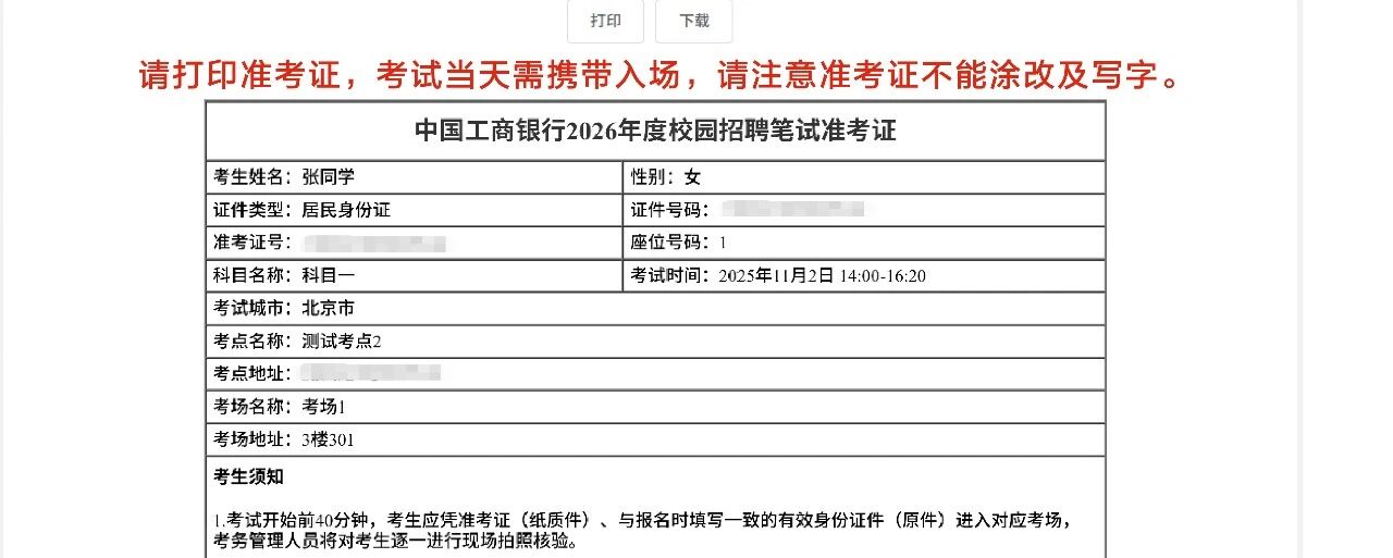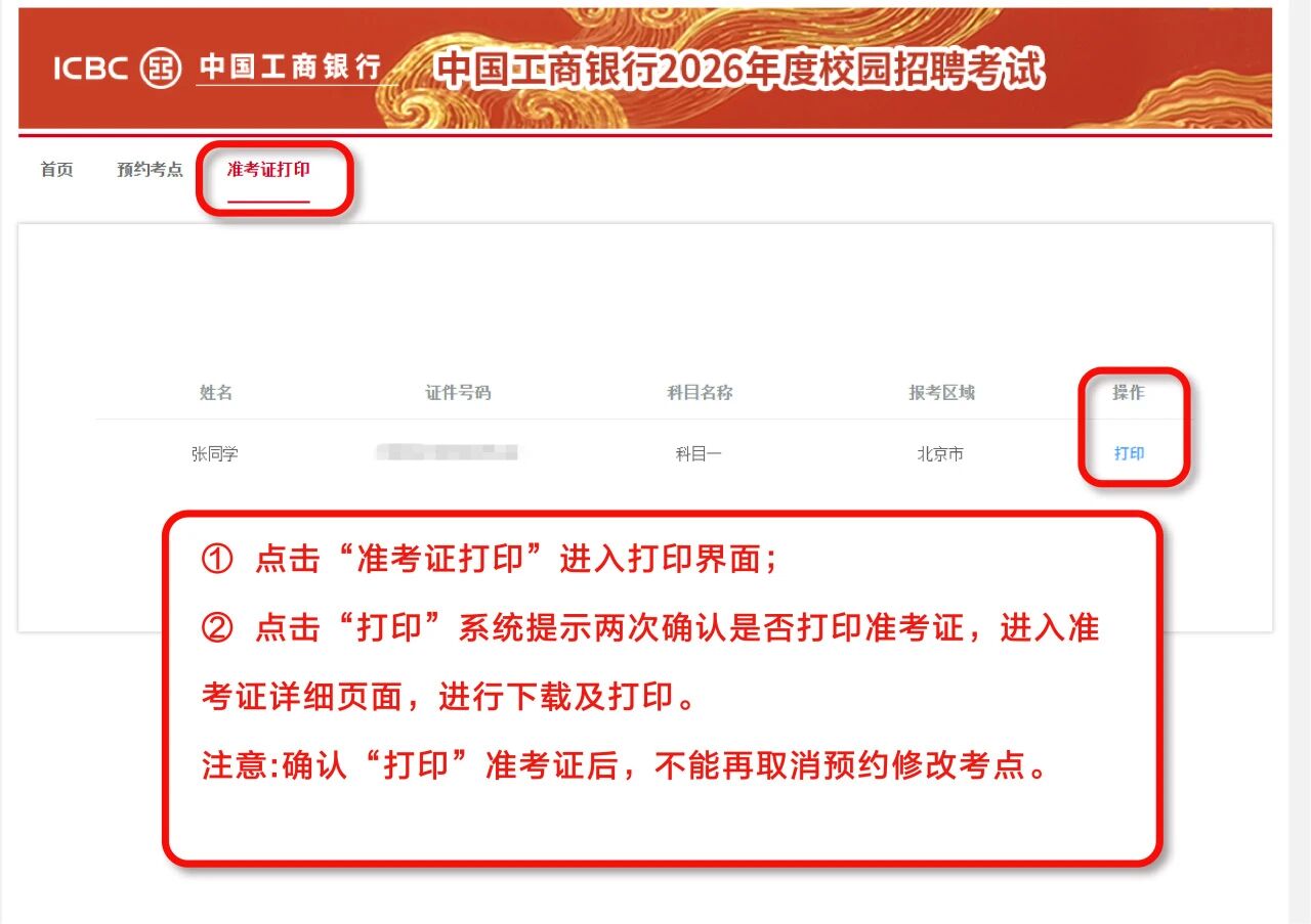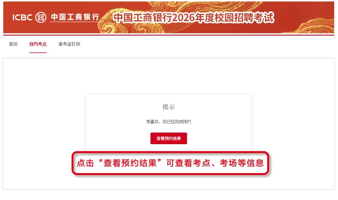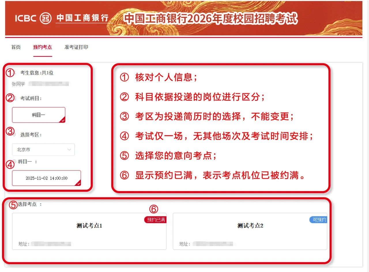 6. 考点预约及准考证打印通知已通过短信、邮件、工行招聘官网站内信渠道发送,请注意查收。更多信息请登录工行人才招聘官网( https://job.icbc.com.cn)查看《考生须知》;