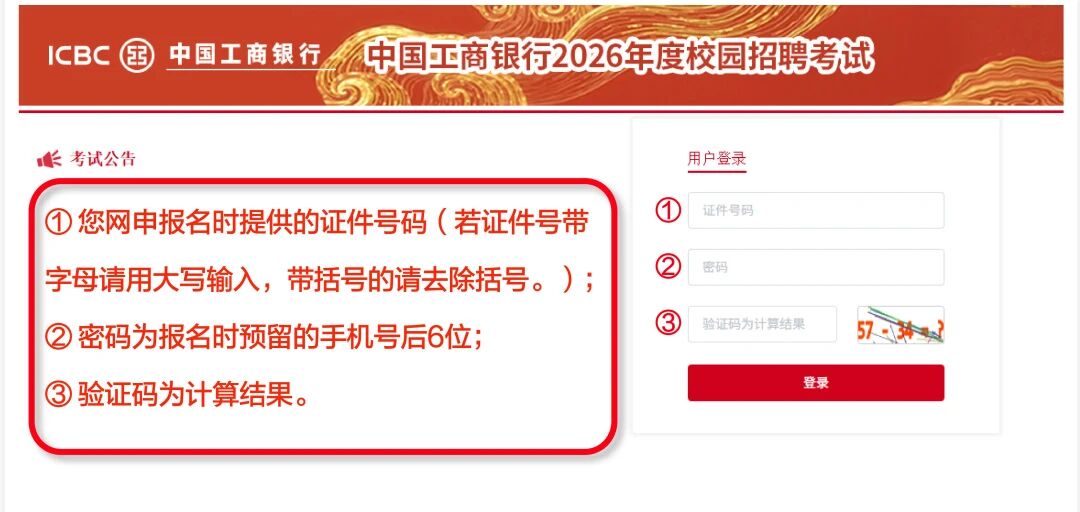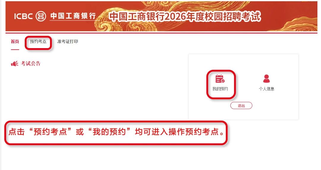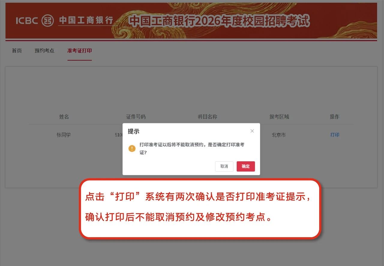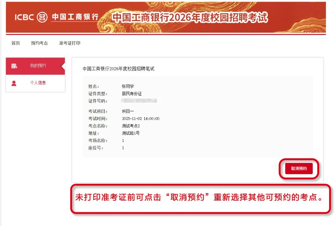 6. 考点预约及准考证打印通知已通过短信、邮件、工行招聘官网站内信渠道发送,请注意查收。更多信息请登录工行人才招聘官网( https://job.icbc.com.cn)查看《考生须知》;