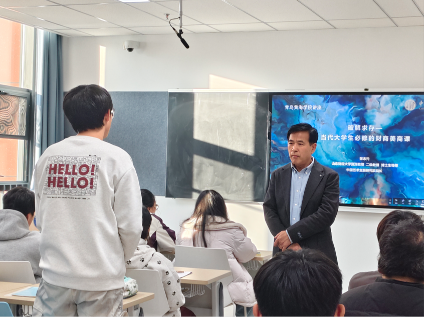 张志元教授首先详细了解了国际商学院的建设现状与未来发展规划,结合自身深厚的学术积淀和丰富经验,围绕学院学科建设、师资团队建设、科研项目申报及教学重心优化等关键领域提出针对性建议,为学院高质量发展提供了宝贵思路。在面向学生的专题授课环节,院长助理王佳璇先向金融科技专业学生介绍了张志元教授的学术背景与研究成果。随后,张教授以生动鲜活的案例为支撑,系统阐释了财商与美商的核心内涵及重要价值,明确提出“财商是创造价值,管理财富的认知、能力和素养;美商是审美的认知、素养和能力,更是精神创造财富的能力”,强调当代大学生应高度重视财商与美商的双重培养。结合自身研究领域,张志元教授还深入讲解了“艺术金融的发展逻辑”“艺术品投资实践”“艺术资产管理研究与人才培养”等专题内容,为学生搭建起专业知识与跨界应用的桥梁。互动交流环节,同学们踊跃提问,张教授耐心答疑解惑,现场氛围热烈融洽。