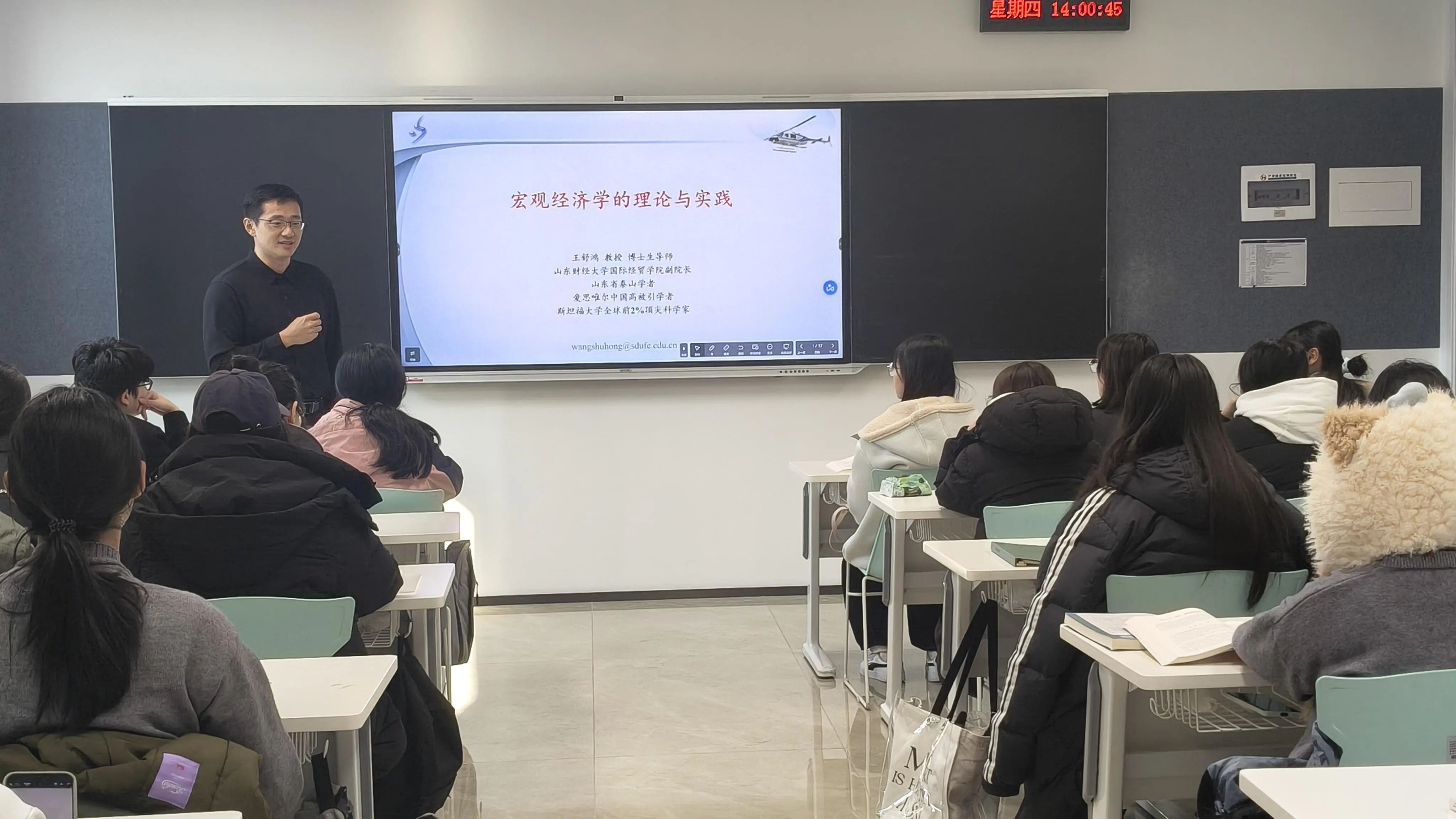 2025年12月4日下午14:00,山东财经大学国际经贸学院副院长、博士生导师王舒鸿教授应邀为国际商学院师生开展专题讲座,主题为“宏观经济学的理论与实践”。作为泰山学者、爱思唯尔中国高被引学者及斯坦福大学全球前2%顶尖科学家,王舒鸿教授凭借深厚的学术积淀与通俗的讲解风格,为在场师生搭建起理论与现实之间的沟通桥梁。
