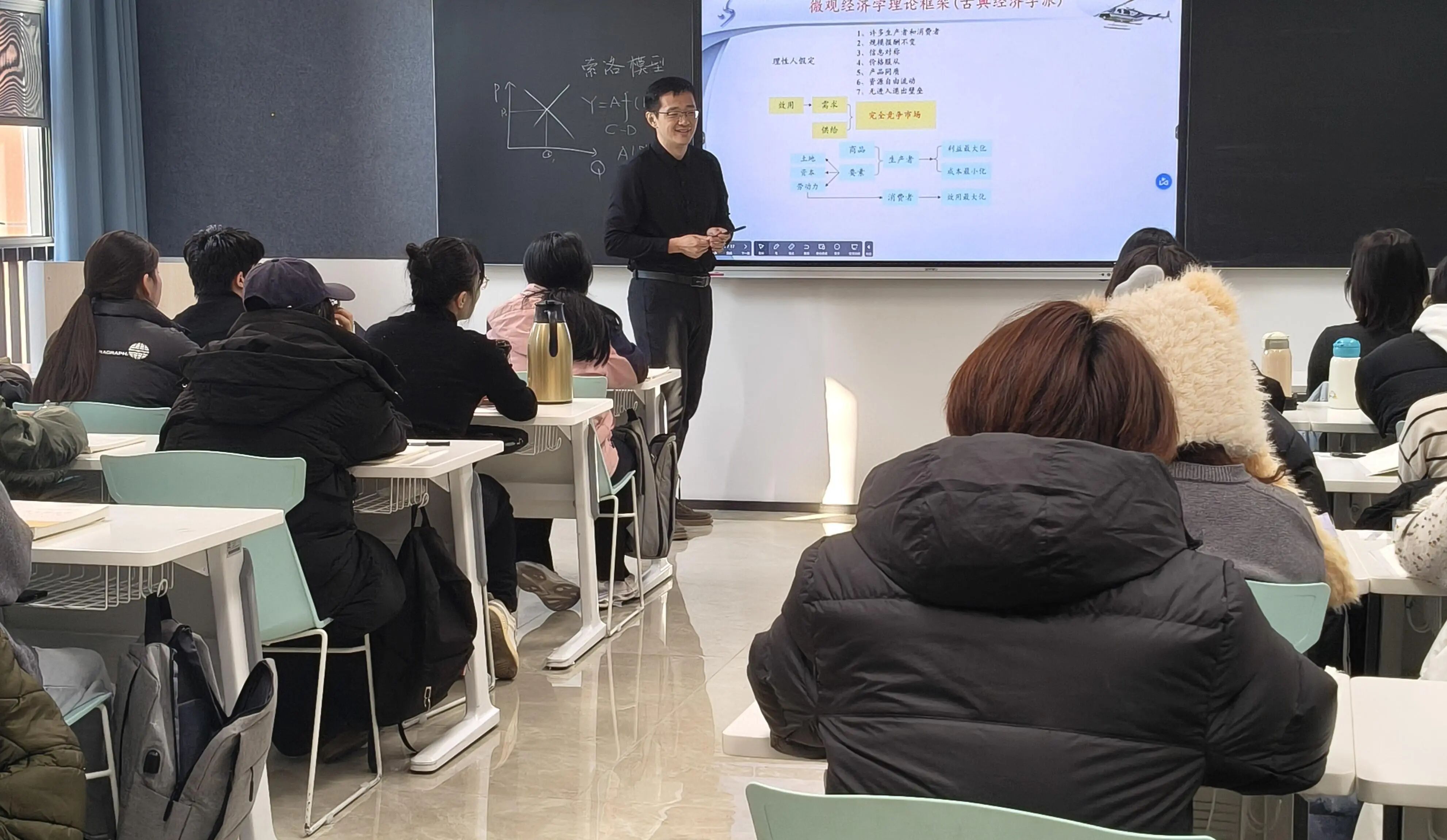 讲座过程中,王舒鸿教授采用深入浅出的授课方式,兼顾知识的广度与深度。他将古典学派与凯恩斯学派的百年论争解读为“自由之手”与“扶持之手”的理论对话,把复杂的IS-LM模型转化为商品市场与金融市场的互动逻辑,并结合美元霸权的历史发展与中国经济“新常态”面临的挑战展开分析,既展现了宏观的全球视野,也体现了鲜明的现实关怀。他特别强调:“学习经济学,关键不是记住结论,而是掌握其背后的逻辑思维模式”,为在场学子的学习指明了方向。