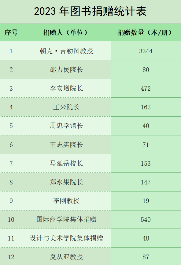 图书是学校教育发展的基石,接受图书捐赠是我校图书馆加强文献资源建设、丰富特色馆藏的重要举措之一。2023年,在学校各二级学院、各部门、广大师生读者和社会各界的广泛关注和大力支持下,我校图书馆共累计接受图书捐赠3万余册。其中校内老教授协会捐赠图书5000余册,校外图书公司及出版社捐赠图书5000余册,林桂臻及周炽成教授捐赠20000余册。在此,青岛黄海学院图书馆向各赠书单位和个人表示崇高的敬意和由衷的感谢!