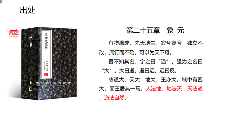 “道法自然”的意思是 “道”所反映出来的规律是 “自然而然” 的。“人法地、地法天、天法道、道法自然”,老子用了一气贯通的手法,将天、地、人乃至整个宇宙的生命规律精辟涵括、阐述出来。“道法自然”揭示了整个宇宙的特性,囊括了天地间所有事物的属性,宇宙天地间万事万物均效法或遵循“道”的“自然而然”规律。