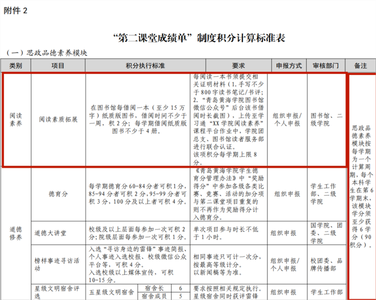 ② 在图书馆每借阅一本(至少15 万字)馆藏纸质版图书,借阅时间不少于一周,且按要求提交证明材料并通过认证的学生读者,可获得阅读素养积分 2 分;每学期借阅纸质版图书不少于 4 册,该项积分上限为8分。