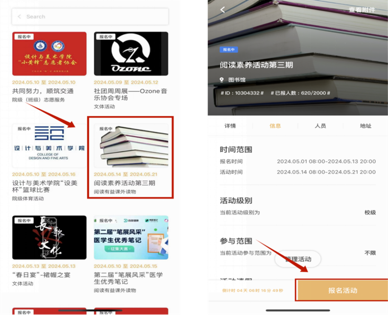 ① 学生读者在“到梦空间”平台报名成功后(即报名开始时间起)即可开始借阅书籍,报名截止后学生读者不可再参加本次活动,活动开始后(即活动开始时间起)为正式上传相关证明材料时间,活动结束时间为截止时间,此时间点前未上传证明材料的同学视为未参加本次活动。
