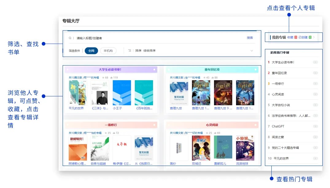 在专辑大厅,可浏览其他读者创建的专辑,进行点赞/收藏。