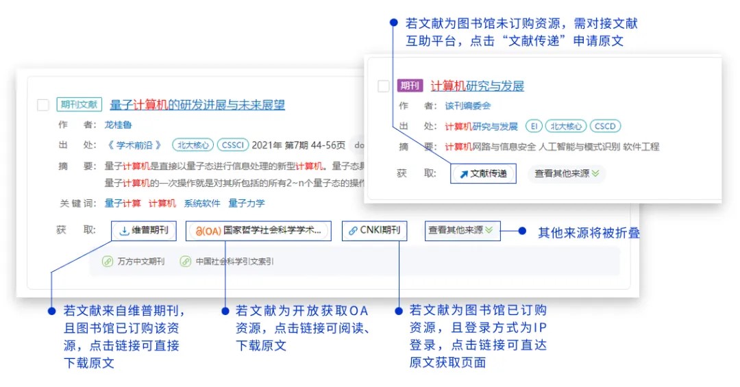 针对不同来源的资源,经纶提供不同的原文获取方式。