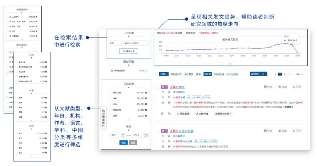 点击检索框右侧的“高级检索”按钮,在弹出的页面中,组合多个条件进行限定性检索。