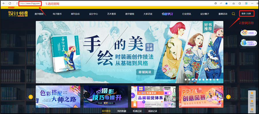 功能板块:上方功能栏,根据功能内容分为【数字教程】【电子图书】【期刊杂志】【设计中心】【艺术素养】【数字展馆】【大家访谈】【专题学习】【行业资讯】【设计圈子】【赛事活动】,共十一大板块,可选择所需功能及资源使用;