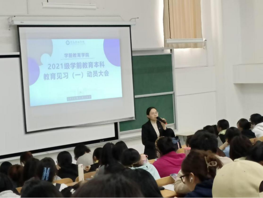 为扎实推进教育见习工作,提升师范人才培养质量,4月14日下午,学前教育学院于知韵楼001教室召开2021级学前教育本科教育见习(一)动员大会。出席会议的有学前教育教研室(一)主任毛玉蕊、学前教育学院团总支书记李斐、辅导员刘燕以及各班见习指导教师。本次会议由毛玉蕊主任主持。