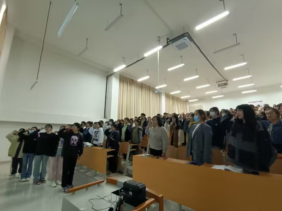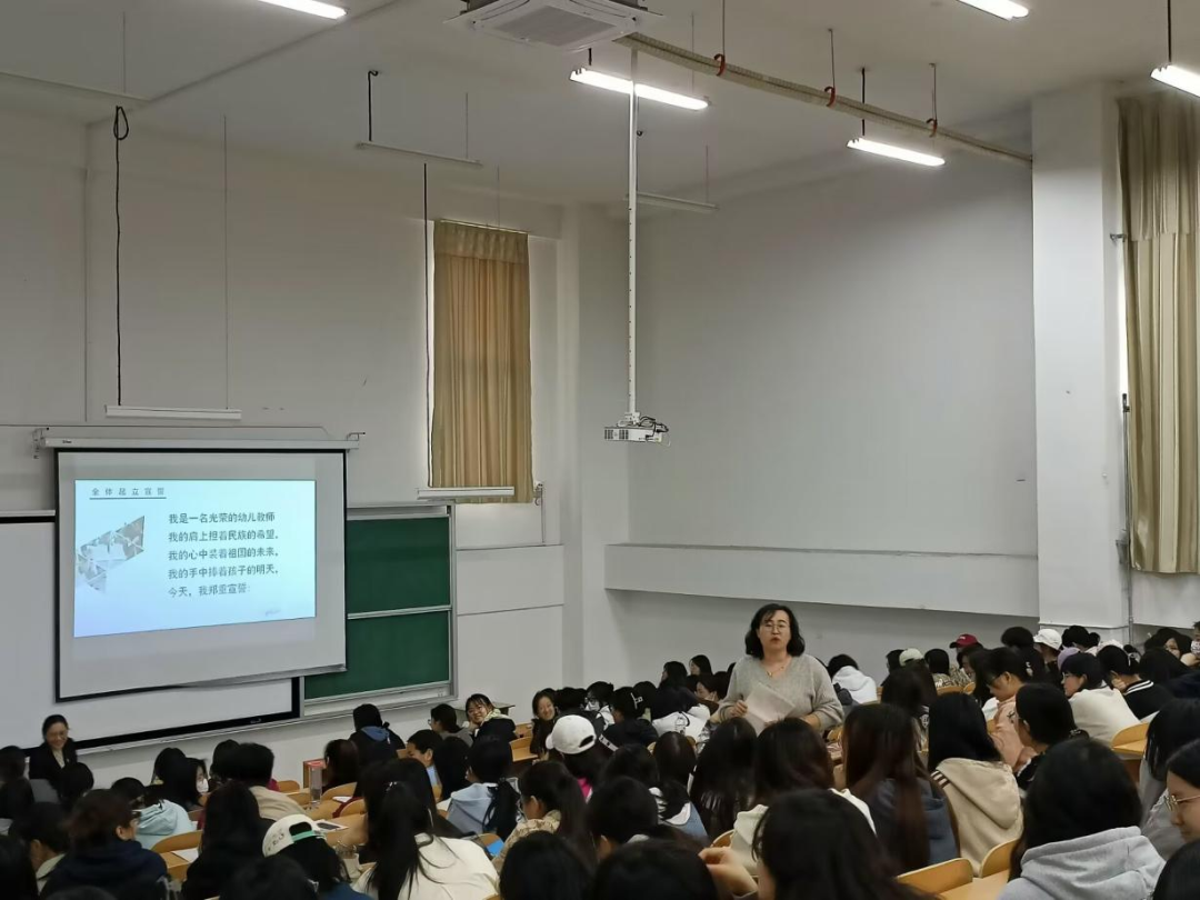 会议尾声,在张郑一同学的带领下,2021级全体同学以及指导教师起立诵读幼儿园教师誓词。通过完成庄严的宣誓,同学们感受到幼儿园教师的庄严使命,进一步加深了对教育见习工作的认识。伴随着一阵热烈的掌声,本次见习动员大会圆满落幕。