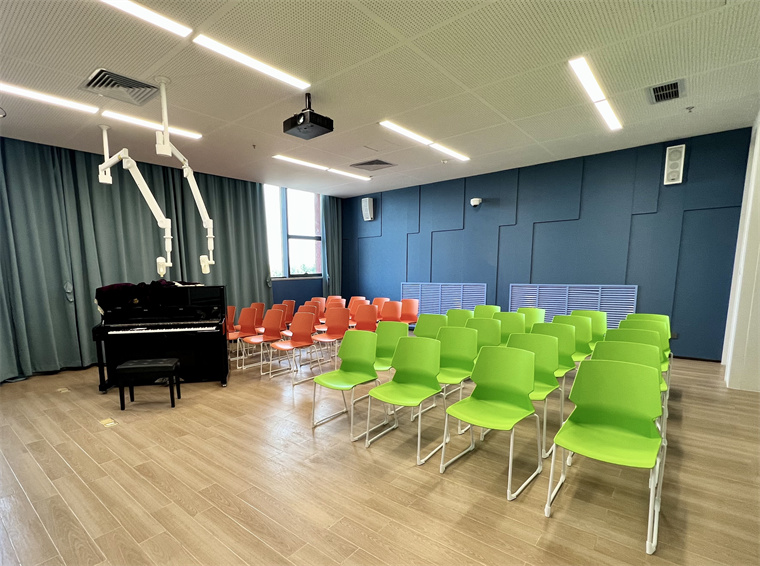 实训室集视、听、练为一体,配备了万向臂、高清术野摄像机、智慧教室教学控制系统等教学设施,具有一键上下课、信号切换、环境控制、录播等功能,实现教学的主观化、立体化和智慧化模式,为学生提供全面的音乐学习条件。