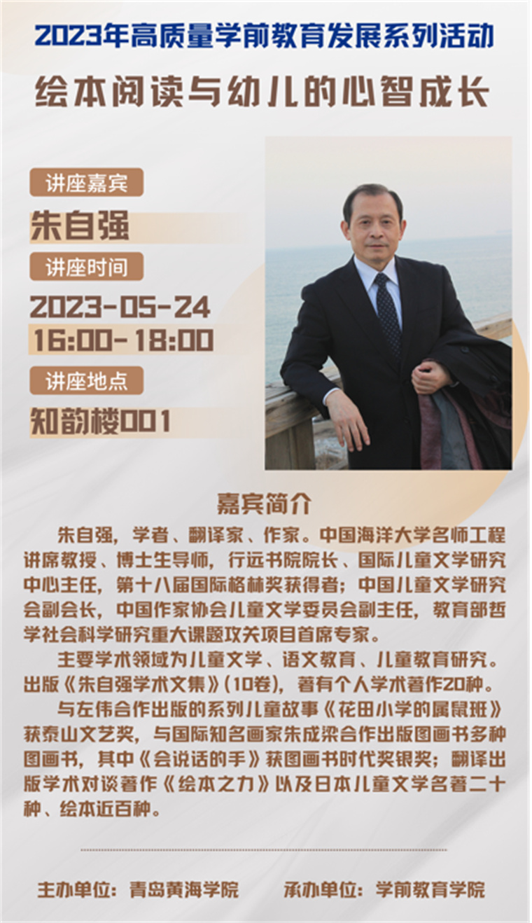 5月24日下午16:00,我院有幸邀请到朱自强教授莅临开展“绘本阅读与幼儿心智成长”专题讲座。本次讲座由刘艺敏院长助理主持,面向我院的全体专任教师和学前教育专业学生,同时也邀请到了幼儿园一线的园长及教师,共同开启绘本阅读的奇妙之旅。