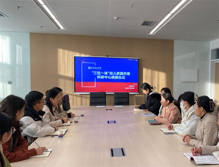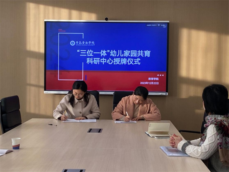 20231222日,我校与青岛灵山卫街道中心幼儿园共建三位一体幼儿家园共育科研中心签约授牌仪式,在知信楼307会议室举行。青岛灵山卫街道中心幼儿园王群园长、灵山卫中心幼儿园业务园长王璠、灵山卫中心幼儿园党建办组织委员于琦,教育学院周萍院长、刘艺敏院长助理等领导出席签约仪式。仪式由刘艺敏主持。