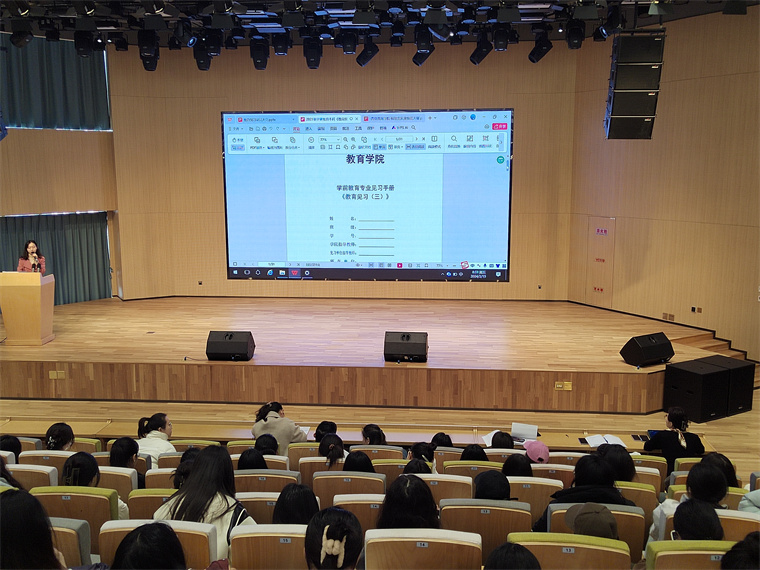 教育实践是培养师范生践行师德、学会教学、学会育人、学会发展的重要方式。为引导师范生以良好的精神面貌迎接见习,稳固推进实践教学的“三习贯通”,教育学院于3月15日上午8:30在知信楼B306召开2021级学前教育本科教育见习(三)动员大会。会议由学前教育教研室(一)主任毛玉蕊主持,各班见习指导教师及辅导员出席会议,2021级学前教育本科全体见习生参会。