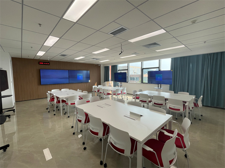 拥有沉浸式智慧教室23间,包括普通智慧教室、AI智慧教室、研讨型智慧教室、直播互动型智慧教室、精品录播教室等,满足师生灵活开展混合式教学、翻转课堂、分组研讨等教学模式改革的需求,实现了日常录课、系统远程监控、门禁考勤等功能于一体,为师生教育教学提供了智慧型教学应用空间。