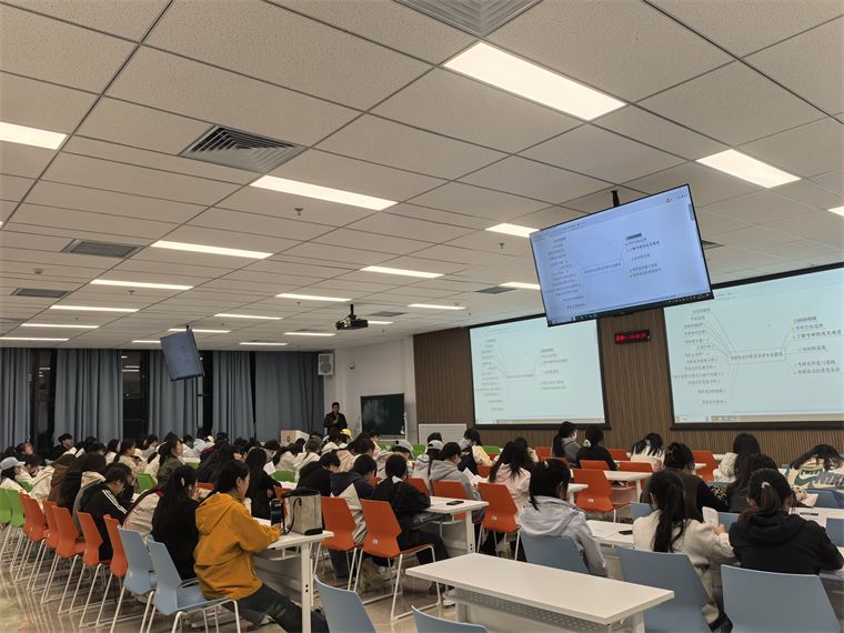 宣讲会上,李伟老师结合教育部2025年考研最新动态,从“国家线变化趋势”“院校调剂政策调整”“专硕与学硕招录差异”三大板块切入,系统剖析了当前考研形势。他通过数据图表直观展示了近年热门专业竞争比例的变化,强调“信息差”是影响考生择校的关键因素,建议学生结合自身实力与院校历年报录比制定“梯度化”备考策略。针对部分专业专硕招生规模扩大的趋势,李伟老师还特别提醒跨考生关注交叉学科方向,以拓宽升学选择空间。