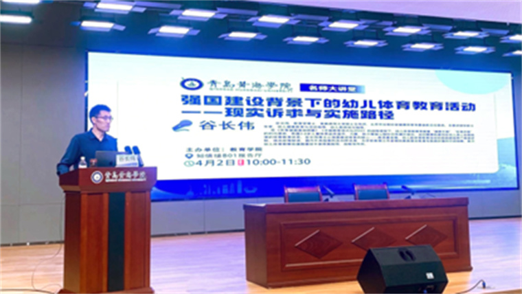 2025年4月2日上午10:00-11:30,教育学院有幸邀请到首都师范大学硕士生导师、北京市保教协会健康体育专委会副主任委员谷长伟博士来校,在知信楼B01报告厅开展“强国建设背景下的幼儿体育教育活动——现实诉求与实施路径”专题讲座。本次活动由教育学院婴幼儿教育教研室教师陈文硕主持,青岛黄海学院教育学院院长杨昭宁、院长助理刘艺敏出席活动,来自西海岸新区的60余名幼儿园骨干教师代表及教育学院200余名师生代表到场学习。
