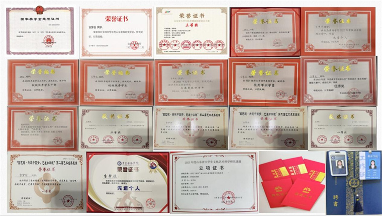 所获荣誉:国家奖学金、山东省政府奖学金、山东省三下乡优秀学生、山东省医养健康创新创业大赛三等奖、青岛市千名优秀大学生、西海岸新区优秀青年志愿者、青岛黄海学院优秀学生、优秀学生干部、优秀共青团员等。