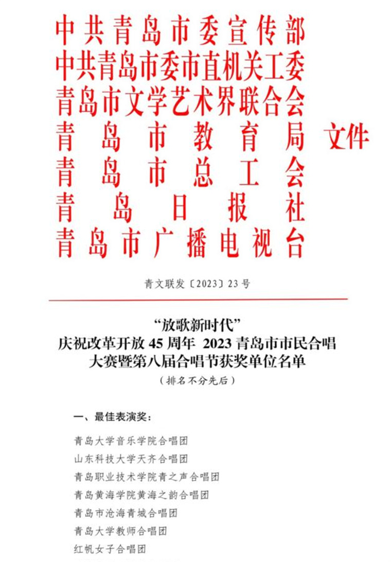 青岛市合唱比赛荣获最佳表演奖、优秀组织奖
