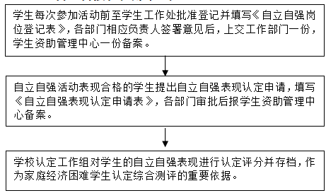 2.学生工作部统计汇总,根据参评学生表现情况,对参评人参加勤工助学、社会实践、志愿者服务及其他管理工作的表现(需提供各项活动登记表证明材料),客观地计算出每位申请人的自立自强测评得分,然后根据分数由高到低排序,作为家庭经济困难学生认定综合测评10%的重要依据。
