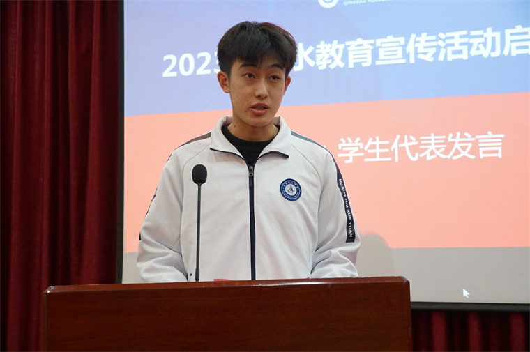 启动仪式第二项,学生代表刘家成发言,他提到“少年志则国志,少年强则国强,青年一代要担当起自己的责任,以身作则,积极参加学校组织的各项节水活动”。