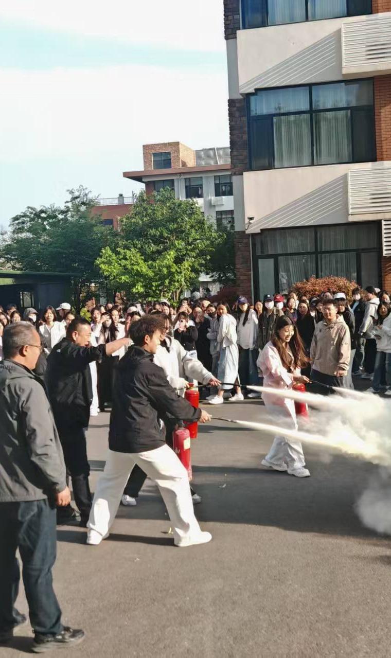 疏散演练结束后,安全管理处工作人员详细讲解火灾预防、逃生技巧及灭火器使用方法,重点演示了“提、拔、握、压”灭火器四步操作法和“甩带、连接、抱握”标准化动作,并设置了油盆灭火场景,组织师生分批次参与灭火器灭火和消防水带灭火实操。