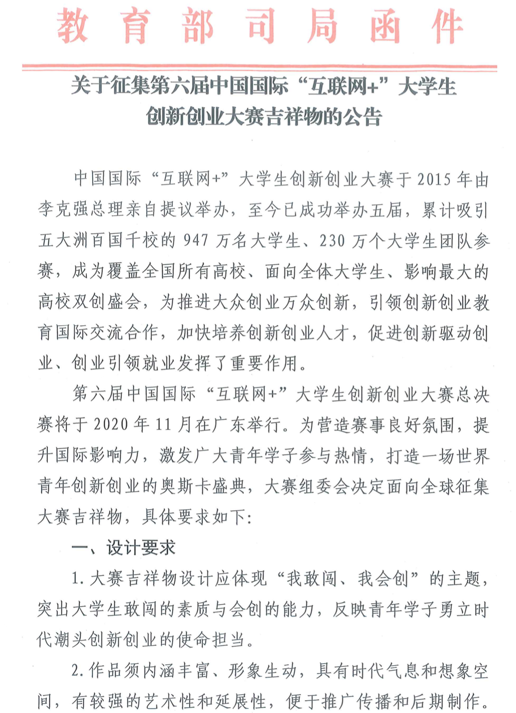 关于征集第六届中国国际“互联网+”大学生创新创业大赛吉祥物的公告