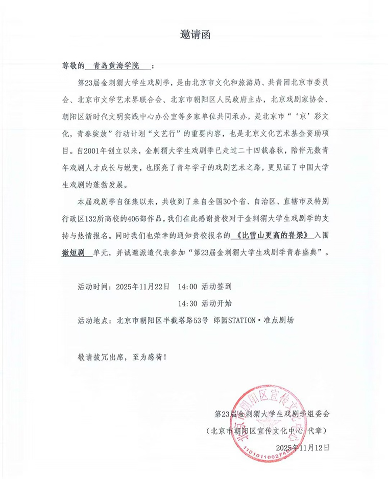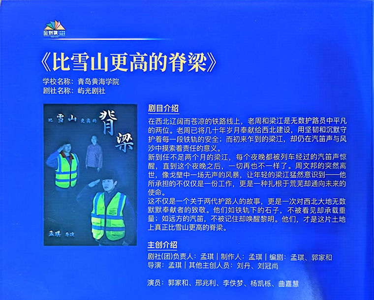 近日,第23届“金刺猬”大学生戏剧季在北京圆满落幕。作为国内最具影响力的大学生戏剧平台,本届赛事吸引了来自清华大学、北京大学、中央戏剧学院、上海戏剧学院等132所高校的406部作品。由我校影视学院表演系教师孟琪执导,表演系主任刘丹、表演系教师刘冠尚与2023级戏剧影视表演专业学生联合创作的戏剧小品《比雪山更高的脊梁》,经过多轮激烈角逐,成功入围“微短剧单元”,展现了黄海学子扎实的专业素养与艺术创造力。