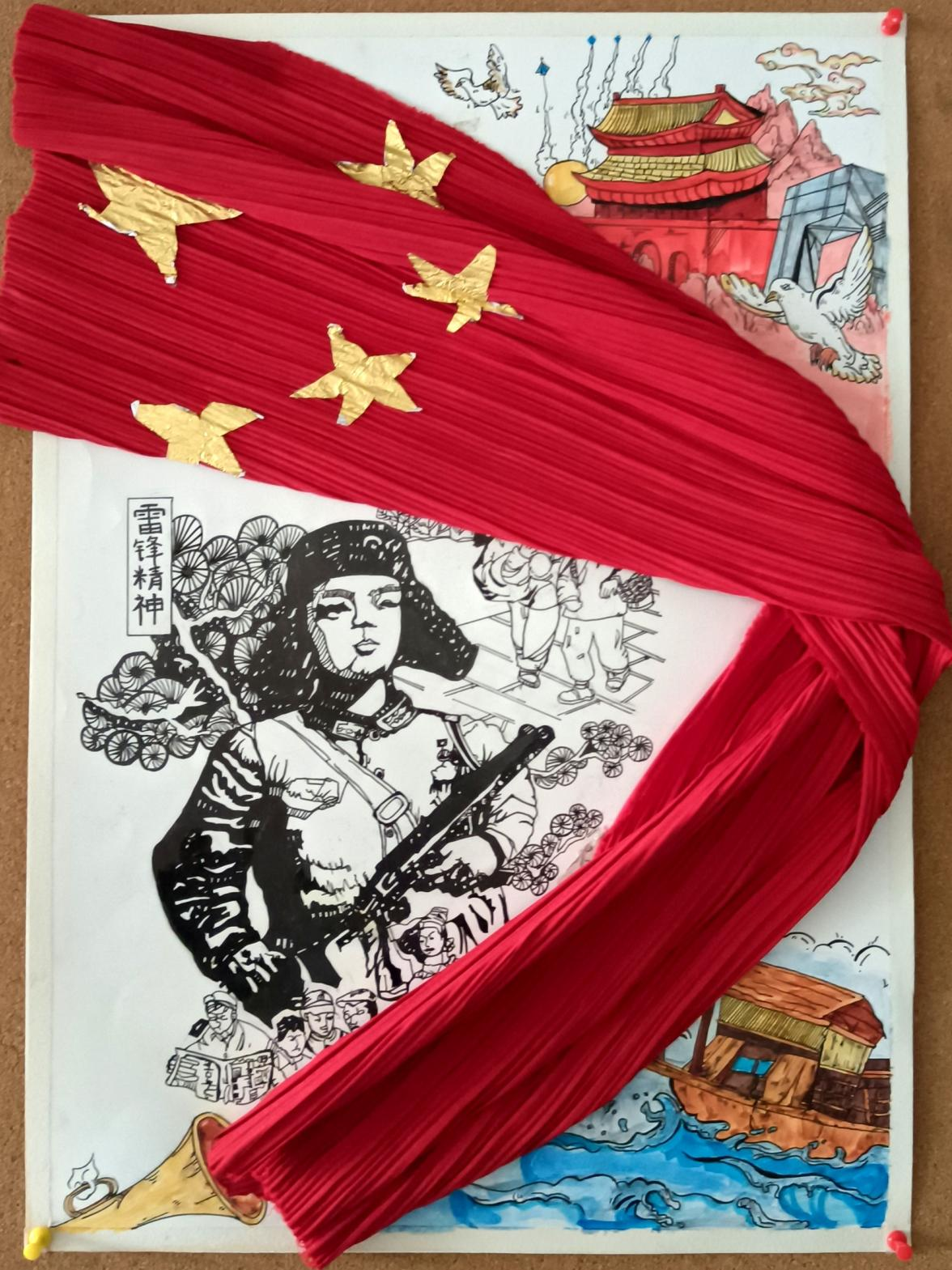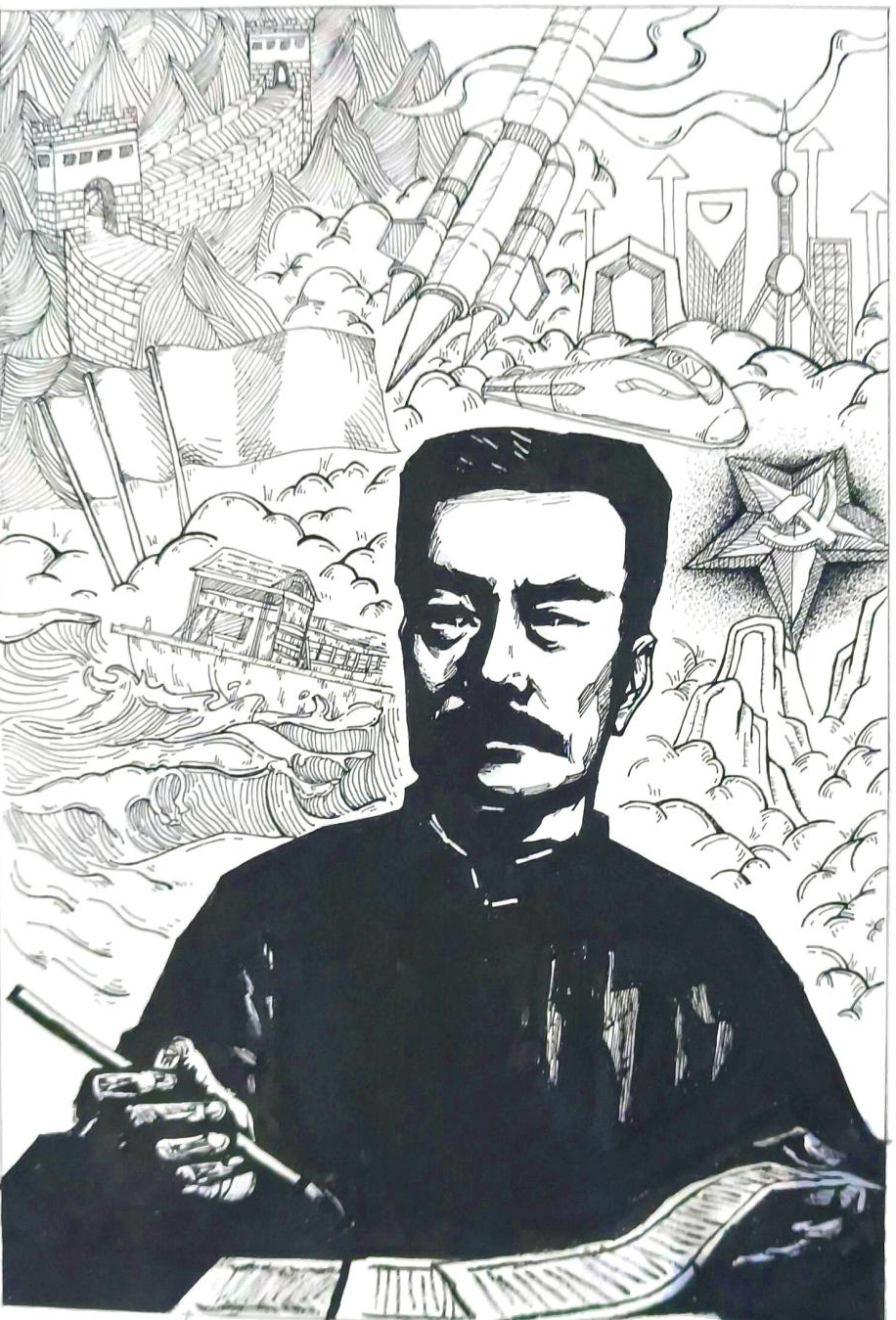 设计说明:这幅黑白画融合多元元素,红船会议是革命起点,长城象征民族脊梁,高铁、火箭体现科技进步,都市展现现代繁华。通过这些元素的组合,展现了中国从历史到现代的发展历程,以及传承与创新精神。