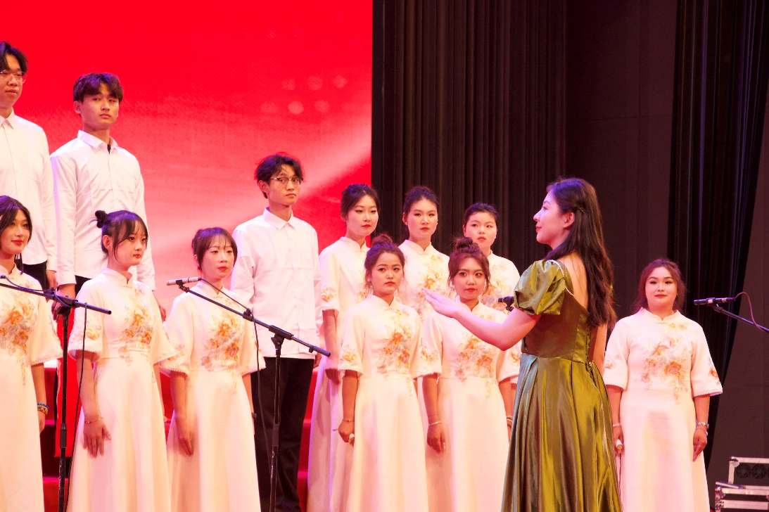 当《上春山》的旋律在舞台响起,青春的声音便与春日撞了个满怀。和声里藏着“二月天”的雀跃,舞步中扬起“四月船”的憧憬,演员们用歌声把理想折成纸鸢,让每个音符都飘着不褪色的热望。没有繁复的道具,只有发光的牌子在光影里拼成星河,映着台下闪烁的眼睛——这就是青春该有的模样,把诗唱给风听,把梦谱成乐章,哪怕跑调也敢让整座山听见回响。舞台灯光璀璨,设计与美术学院合唱团的成员们身着精心设计的演出服装,精神饱满地登上舞台。《上春山》作为此次演出的曲目,在专业教师和体育部的引领下,团员们默契配合,以层次丰富的和声、细腻的情感表达,将歌曲中对春山的向往与热爱展现得淋漓尽致。时而轻柔婉转,仿佛山间微风拂面;时而激昂高亢,恰似春山磅礴气势,歌声在整个演出场地回荡,深深感染着每一位观众。