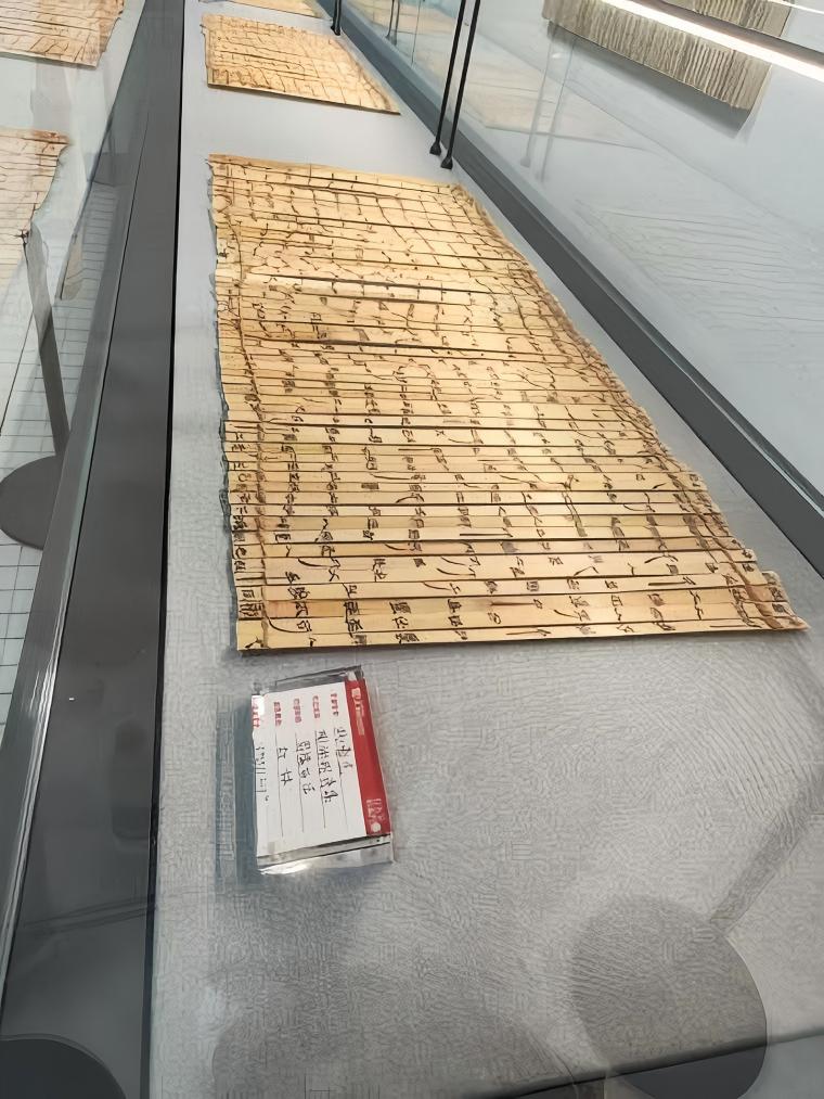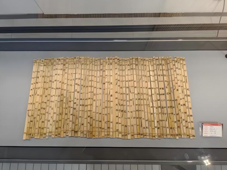 平铺式复原: 竹简按古法用麻绳编织平铺于展柜内,直观还原古代简册的原貌,便于观众近距离欣赏文字细节与制作工艺。