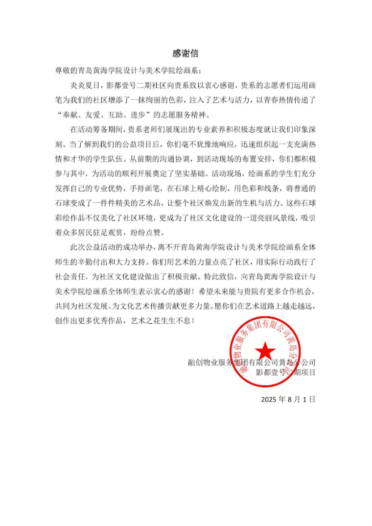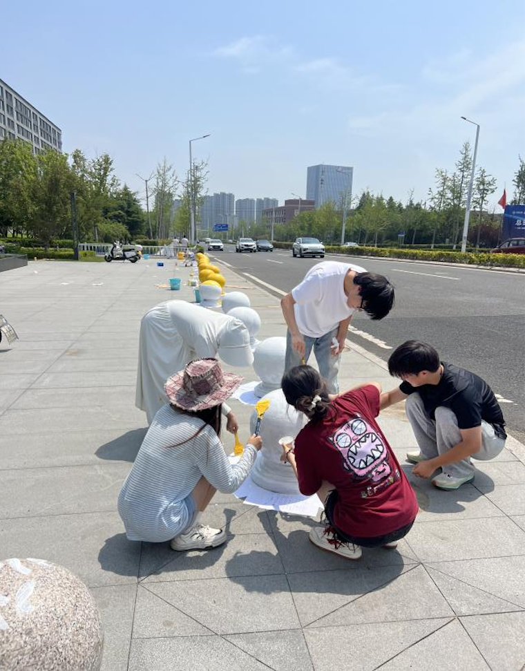 在城市的钢筋水泥间,艺术是点亮生活的星火。6月25日设计与美术学院绘画系教师赵中蕾、迟燕语、张晓钰带领系部5名学生在影都壹号二期社区参与石球彩绘艺术公益活动,大家以石球为画布,蘸色彩作笔,为社区增添独特艺术风景。