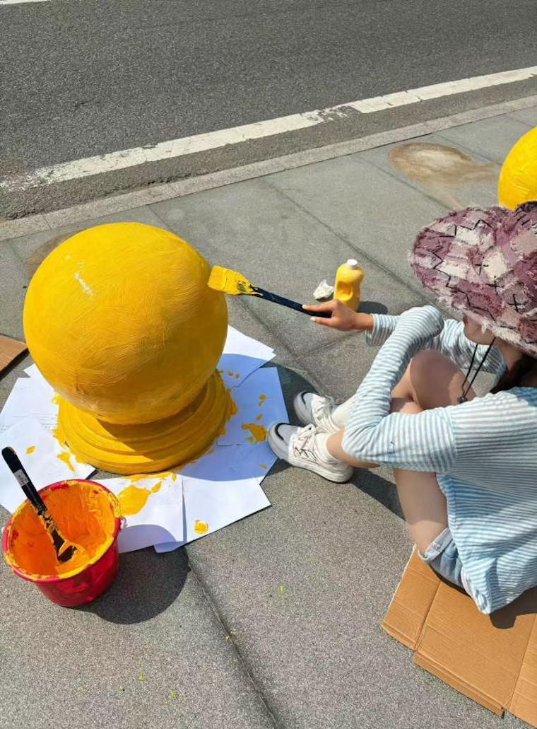 活动当日,志愿者们早早来到影都壹号二期,摆放好颜料、笔刷,看着眼前灰白的石球,创作热情瞬间被点燃。活动以“小黄鸭”作为画风参考,结合石球圆形特点,志愿者们积极展开了二次创作。他们用黄色颜料填充小鸭身体,细致描绘出翅膀、嘴巴,让小鸭仿佛从春日花园中“跳”到石球上,一笔一划,将对艺术的热爱融入色彩里。有的让小鸭“站”在石球上晒太阳,有的是绘制小鸭排队嬉戏场景,还有的融入花朵、水果等元素,让画面更丰富。