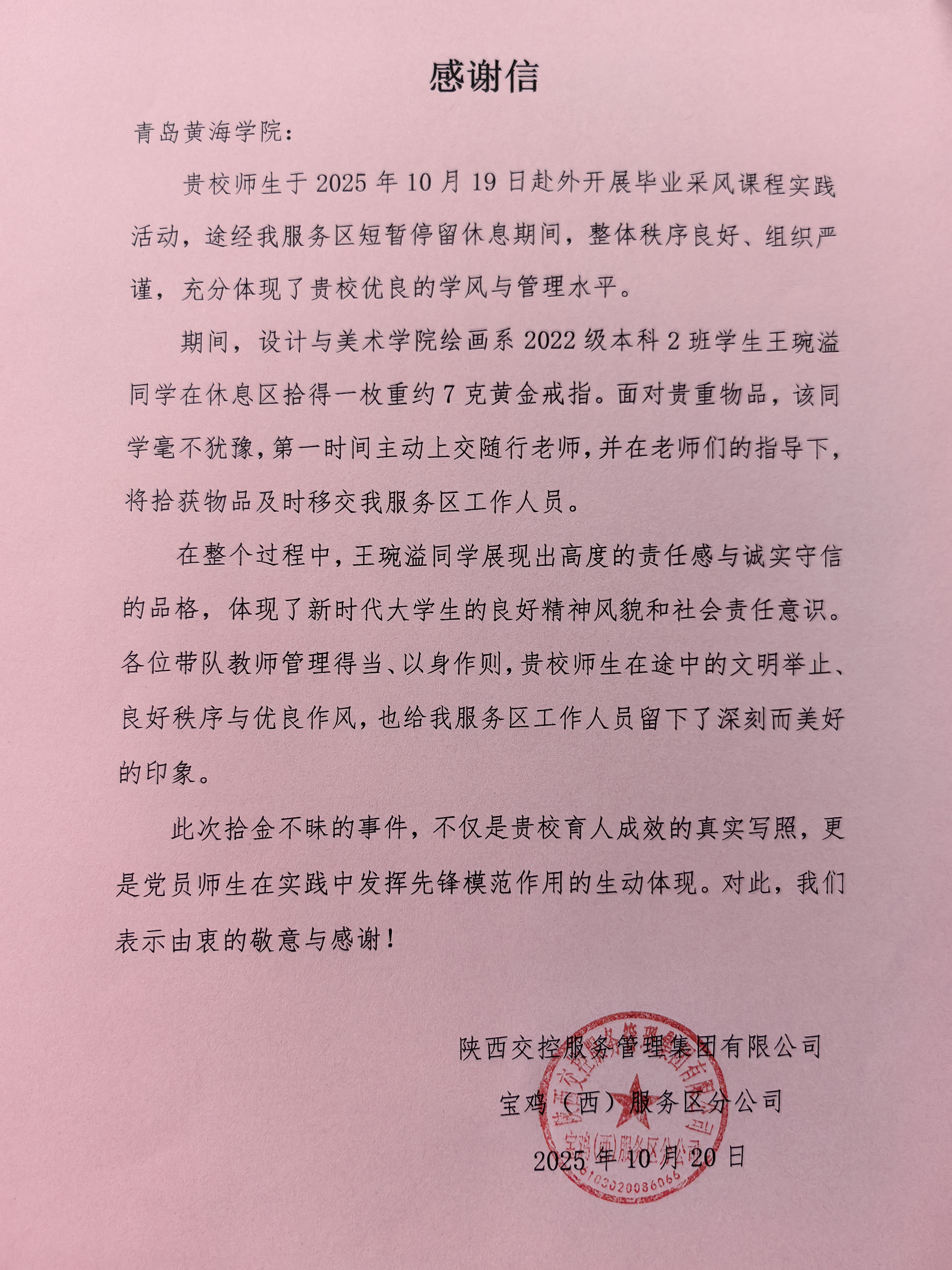 10月20日,学院收到来自陕西交控服务管理集团宝鸡(西)服务区分公司的感谢信。信中对王琬溢同学拾金不昧的行为给予高度赞扬,指出该生“面对贵重物品毫不犹豫上交,以实际行动展现出新时代大学生高度的责任感与诚实守信的可贵品格”,并对青岛黄海学院党员师生在采风活动中的组织规范和文明素养表示充分肯定。