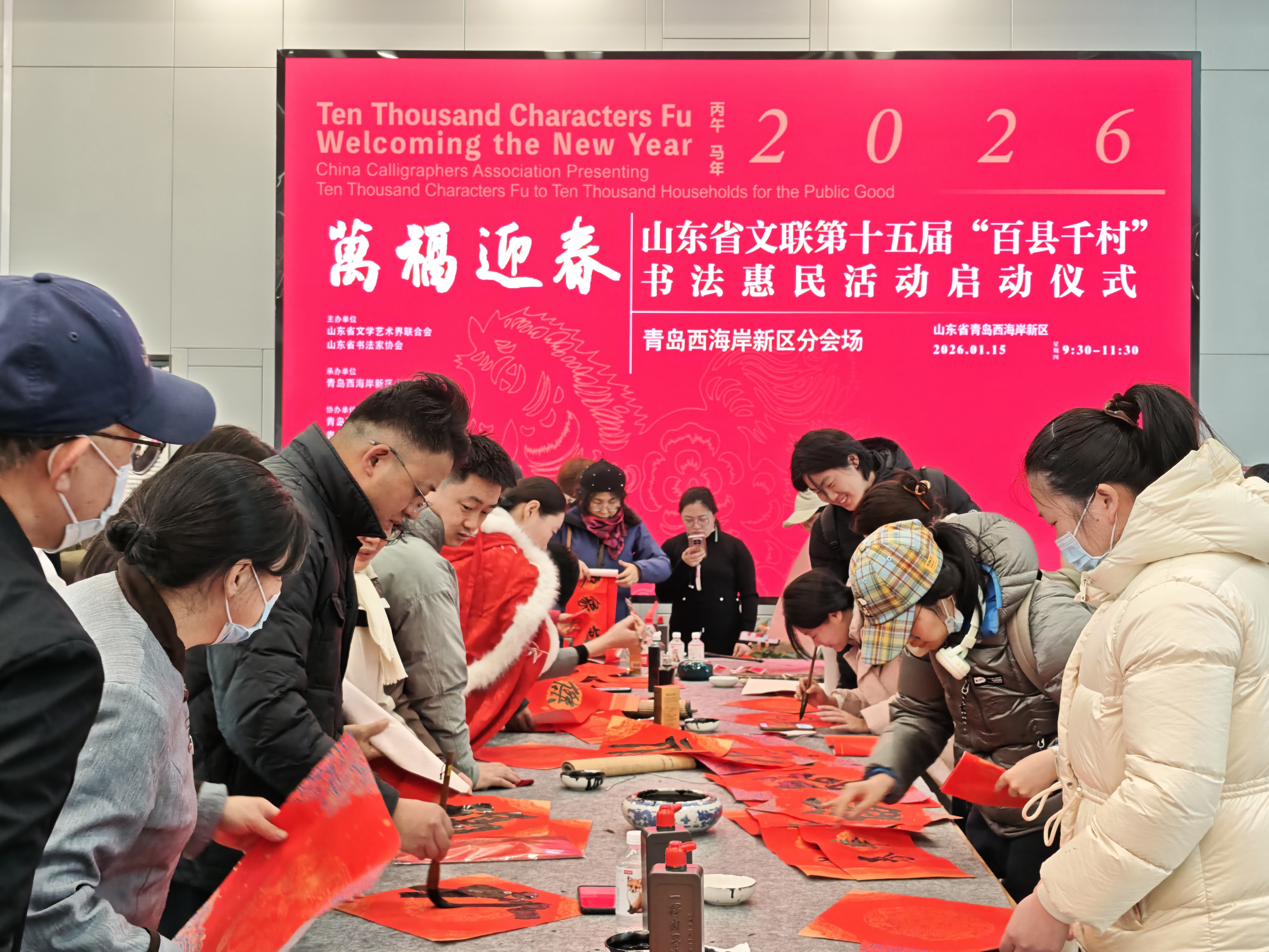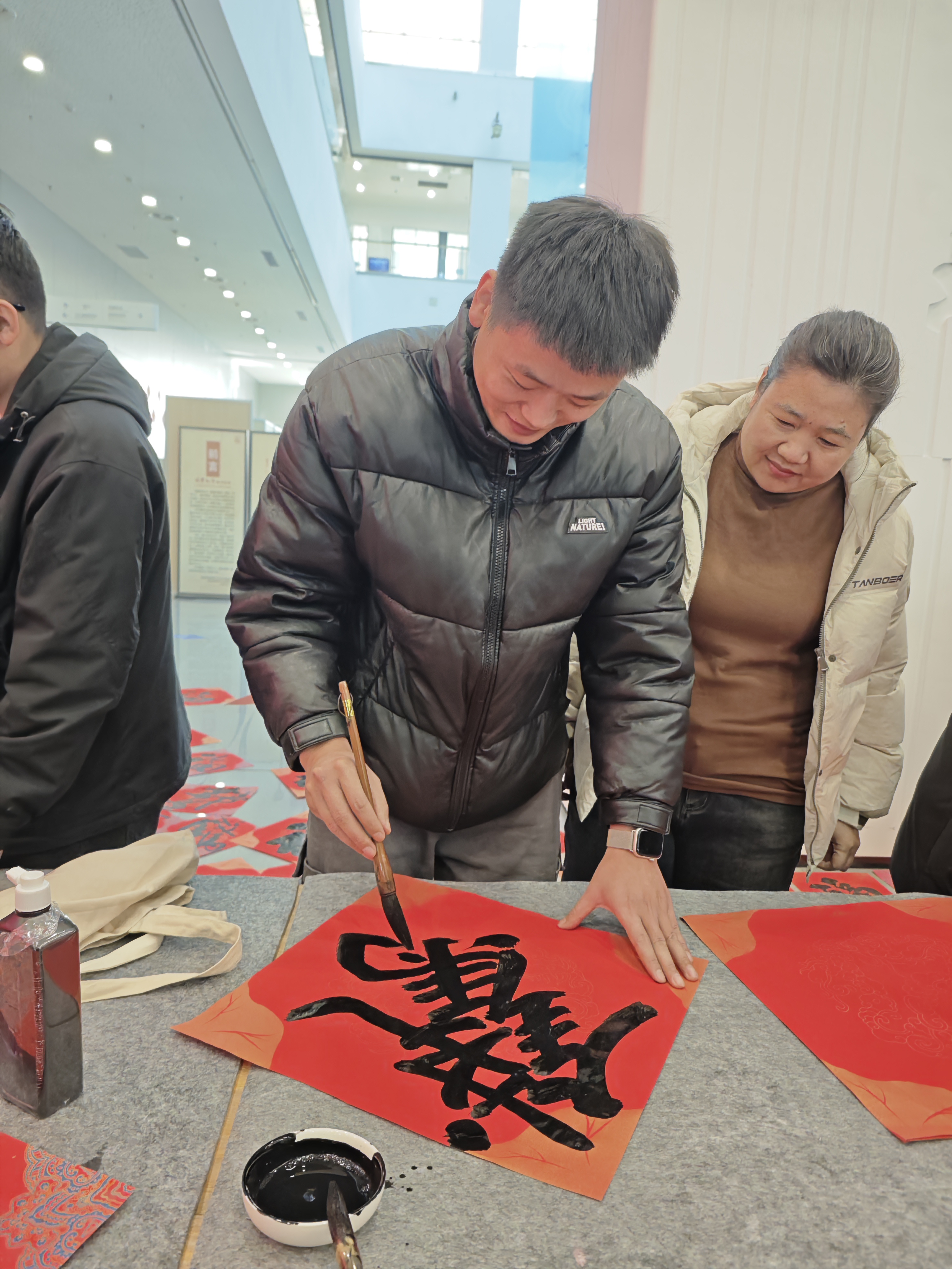 翰墨飘香添年味,福字送暖入民心。近日,“万福迎春——山东省文联新时代文明实践第十五届‘百县千村’书法惠民活动”青岛西海岸分会场,在青岛西海岸新区图书馆一楼大厅圆满举办。设计与美术学院书法系董存建主任、书法教师杜林参与活动,与一众书法家同台挥毫,以笔墨为媒,为市民送上饱含新春祝福的春联与福字,让传统书法艺术浸润基层生活。