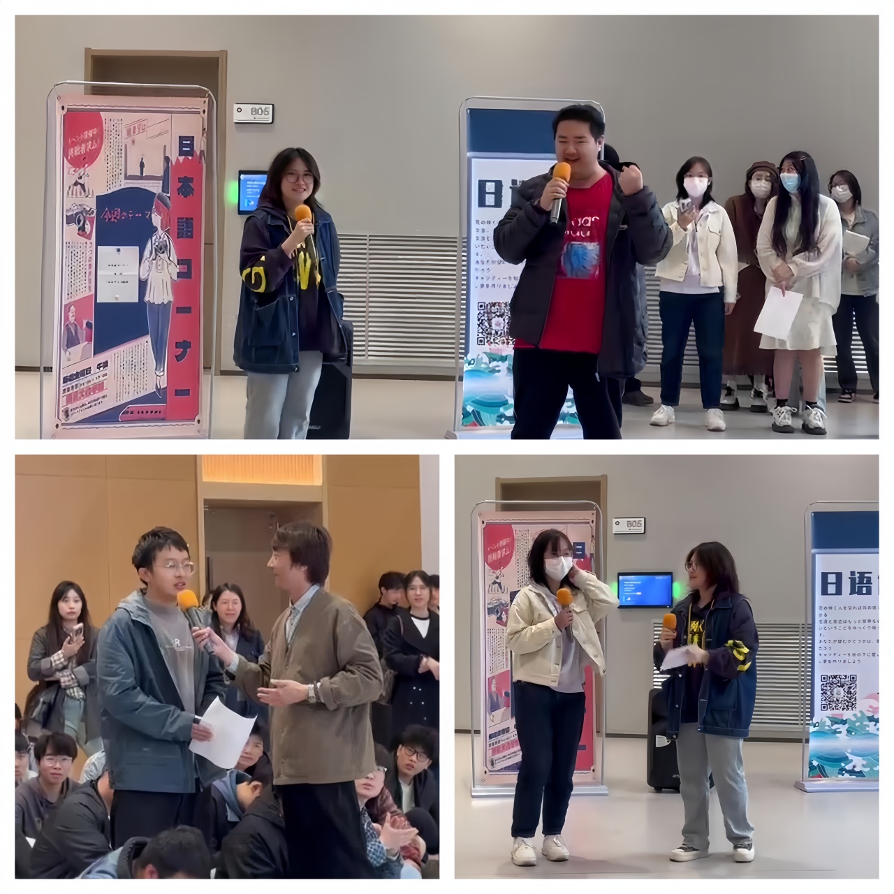 青岛黄海学院语言文化学院于2024年4月12号下午四点在知信楼B01报告厅外成功举办第一次日语角活动,为全校范围内的日语专业学生与其他院系的日语爱好者提供了一个自由交流展示个人日语水平的舞台。全校200多位学生和日语系全部教师出席了本次活动。