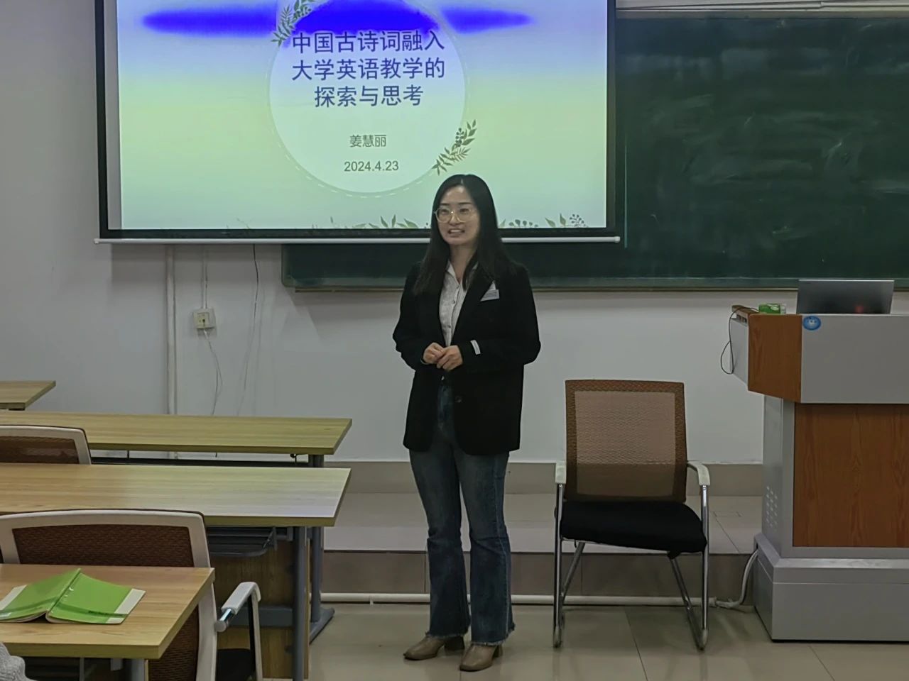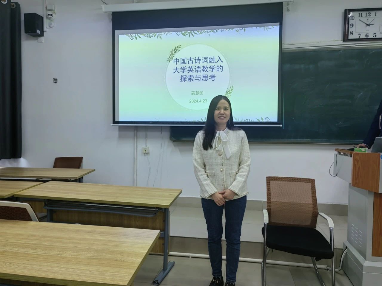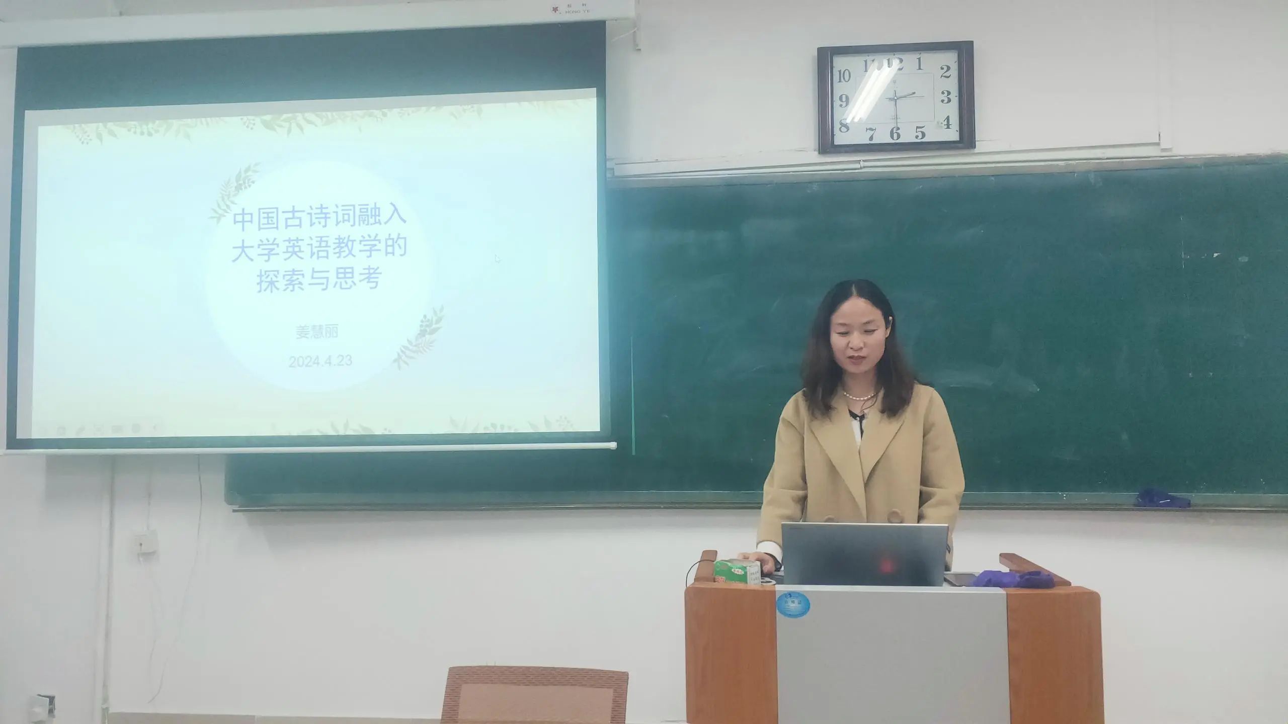 活动伊始,姜慧丽老师就如何融入古诗词元素以提升大学英语教学深度和广度、坚定学生文化自信、推动中国文化走向世界,作了题为“中国古诗词融入大学英语教学”的科研分享。姜老师从本课题的研究背景、研究意义、研究现状以及融入路径四个方面进行了汇报交流,最后以教材《新一代大学英语(基础篇2)》中第三单元 The Art of Communication 的单元主题为例,就沟通的艺术这一话题,融入杜甫的《春夜喜雨》这首古诗,传授学生如何掌握人际沟通技巧,达到事半功倍的效果。“好雨知时节,当春乃发生;随风潜入夜,润物细无声”,诗圣的这四句诗词不仅是对时空环境、季节场景及人们心境的美好描述和向往,也是对事物彼此关联、发展规律、意境境界的高度概括,透露出我们做人、做事不可或缺且极具智慧的哲理,对我们开展社会活动具有很高、很强的启示性、适用性和指导性!